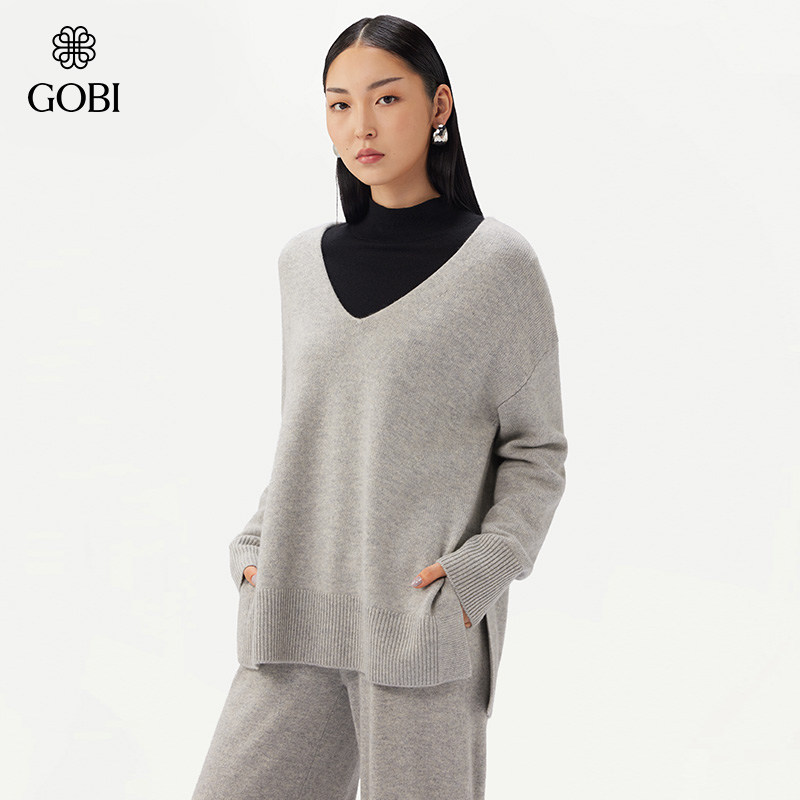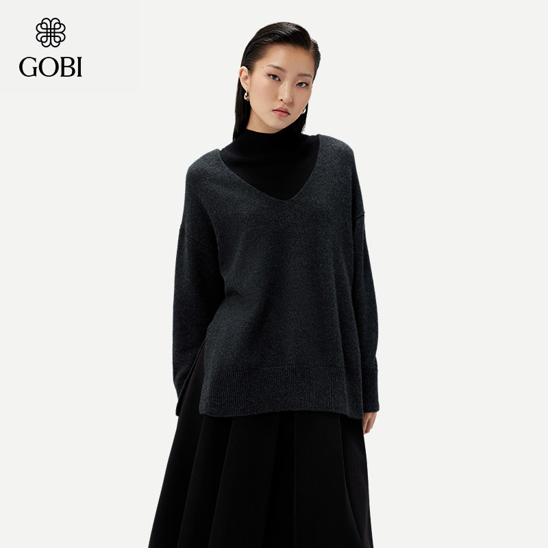 天猫GOBI戈壁秋冬时尚休闲大V领宽松毛衫女士纯羊绒针织衫WK741