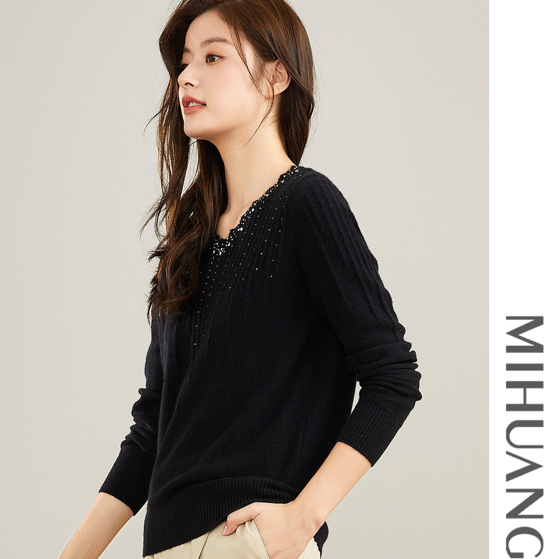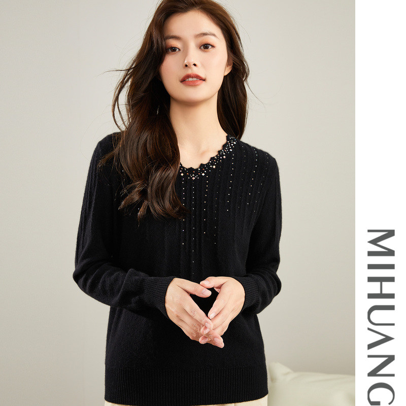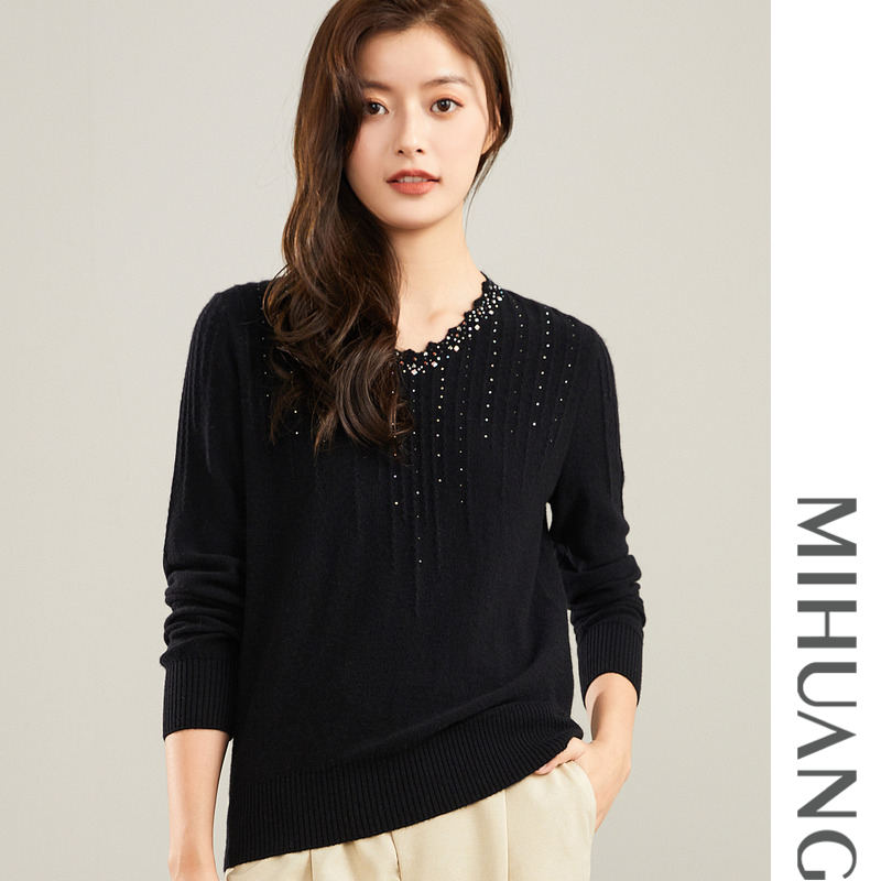 天猫米皇秋季新款套头V领羊绒衫女时尚镶钻纯羊绒毛衣针织打底衫