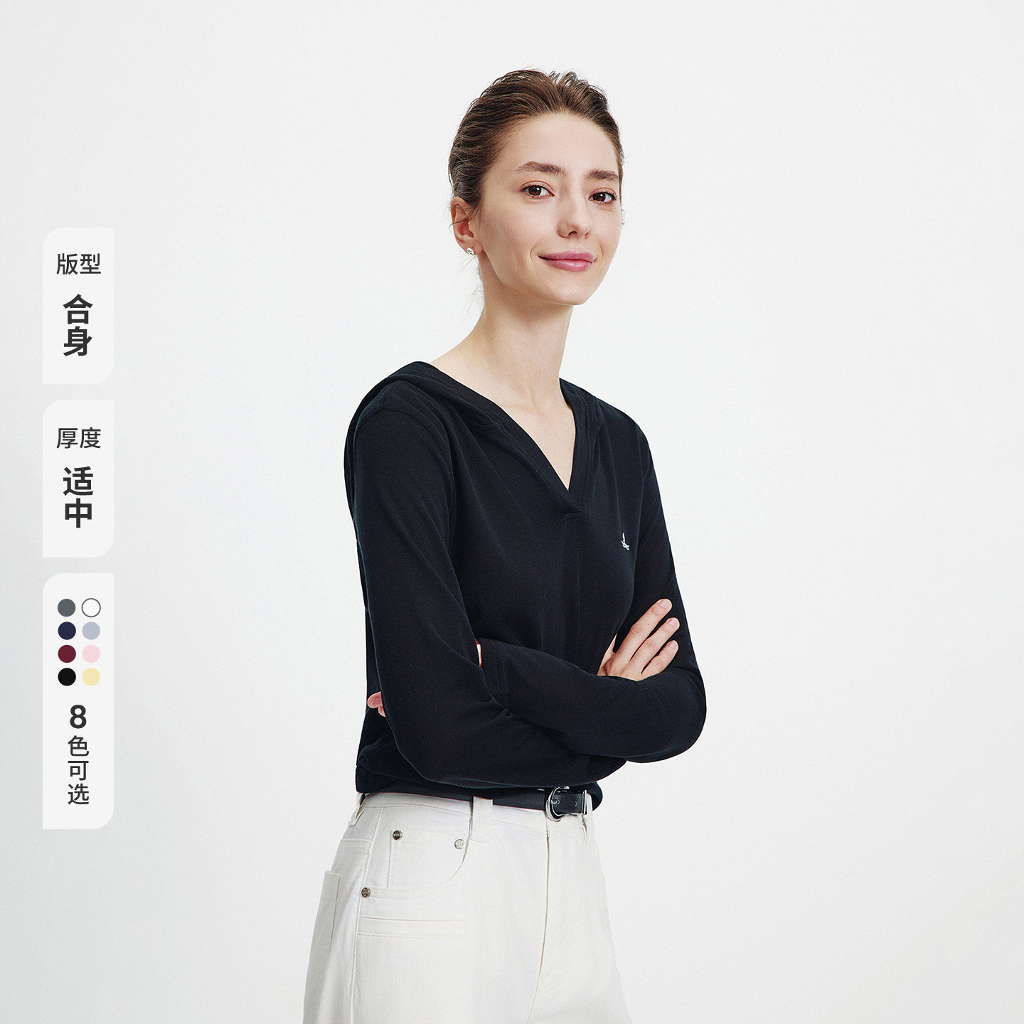 Navigare意大利小帆船2026春季女士V领连帽长袖高弹透气针织T恤衫,融合意式优雅与航海灵感,专为现代女性打造。采用高弹透气针织面料,亲肤柔软,贴合身形又不失舒适自由度。经典V领设计修饰颈部线条,搭配连帽细节,增添休闲动感气息。长袖剪裁适合初春风尚穿搭,无论是搭配牛仔裤还是半身裙,皆显随性优雅。精致的意大利小帆船品牌标识点缀衣身,彰显品质格调。轻盈透气、回弹性佳,兼顾美观与实穿性,是春日衣橱的理想之选,诠释自信从容的航海风格。
