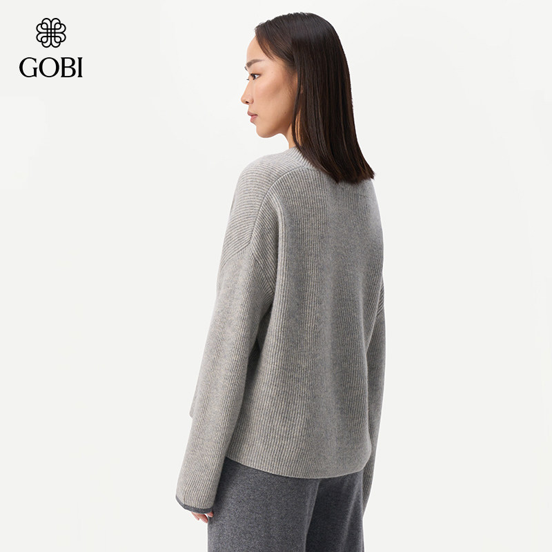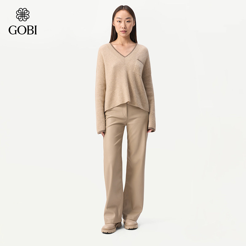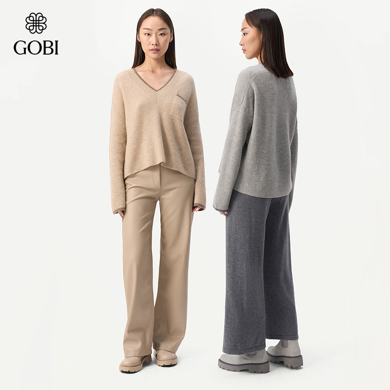 天猫GOBI戈壁秋冬拼色日常简约宽松V领羊绒女士套头毛衣针织衫WK667