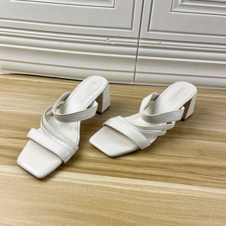 天大东一字带凉鞋女鞋2025夏季新款时尚粗跟一字扣中跟方头凉鞋1071