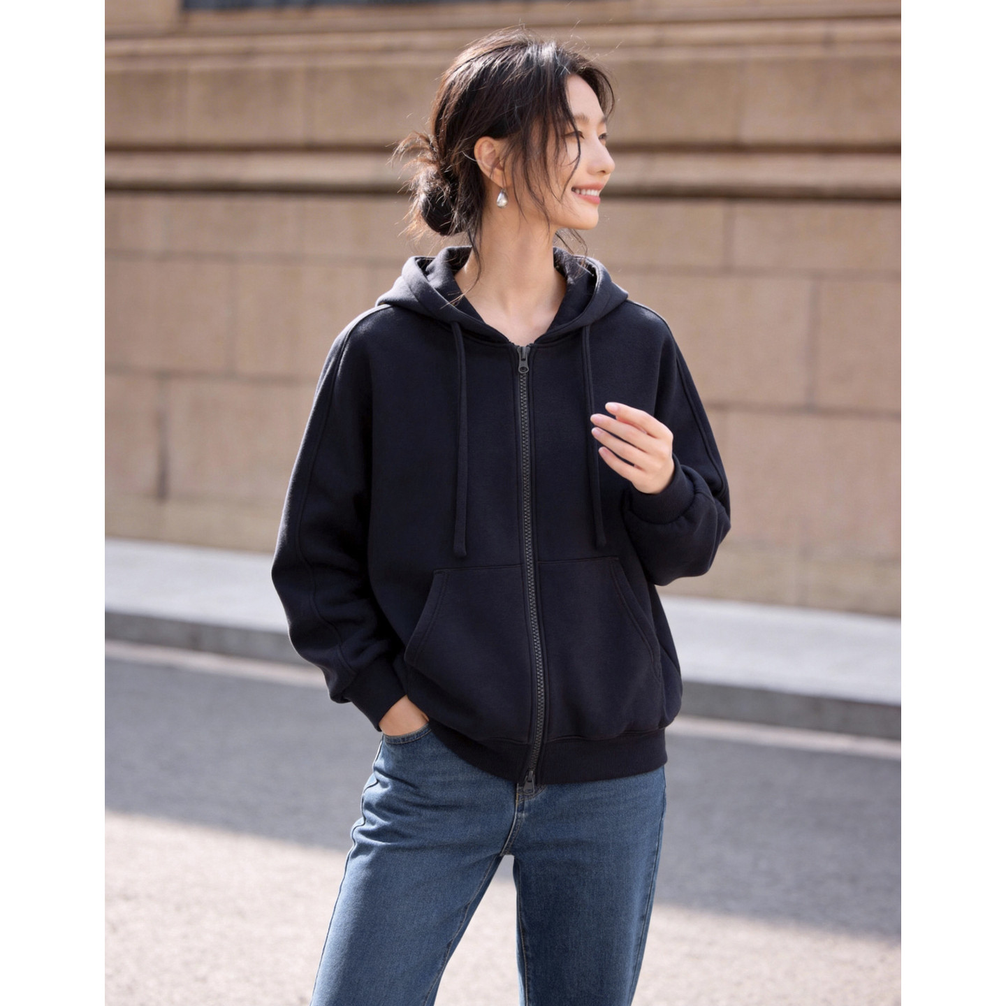 天猫Basic House/百家好纯色连帽卫衣女慵懒风拉链外套春季新款上衣