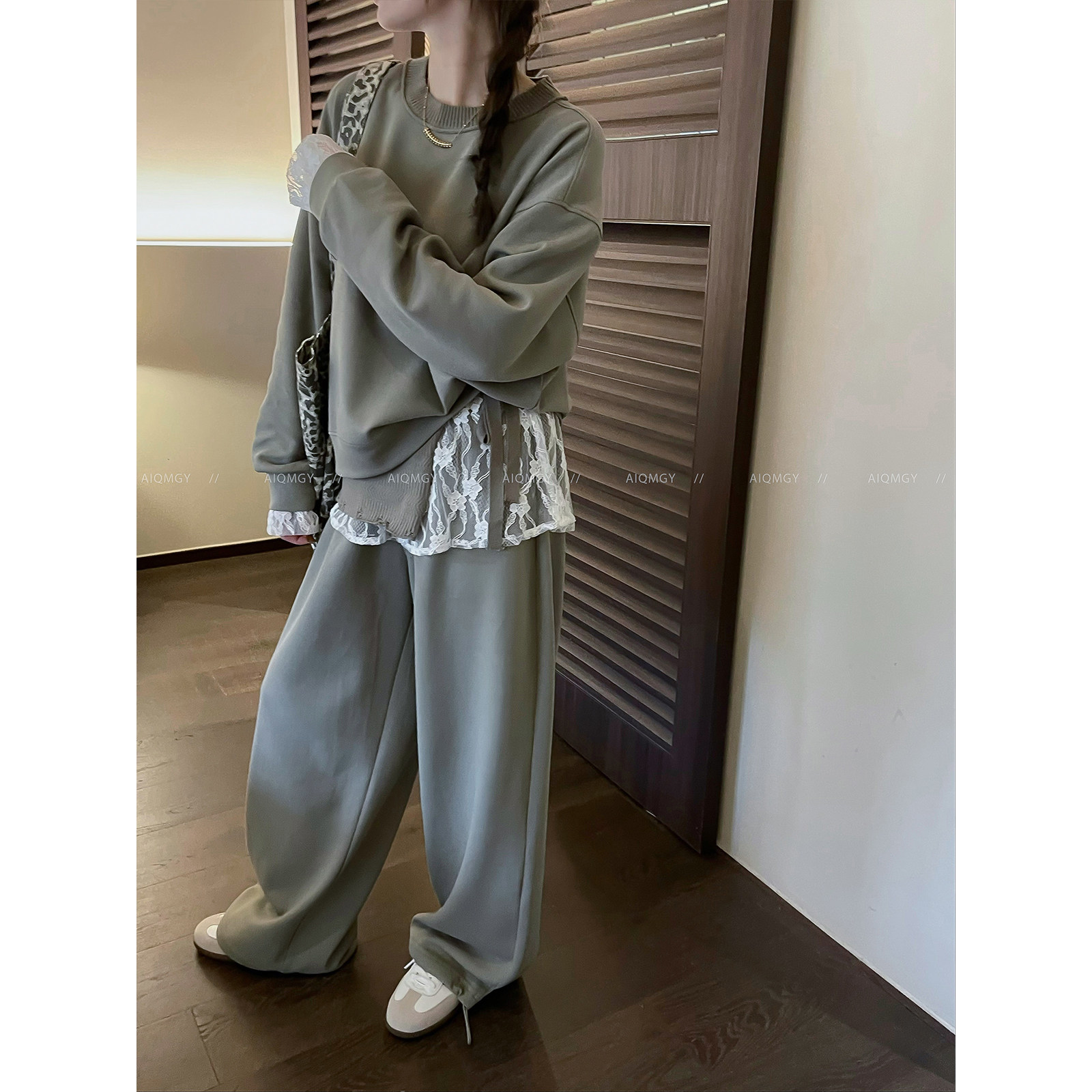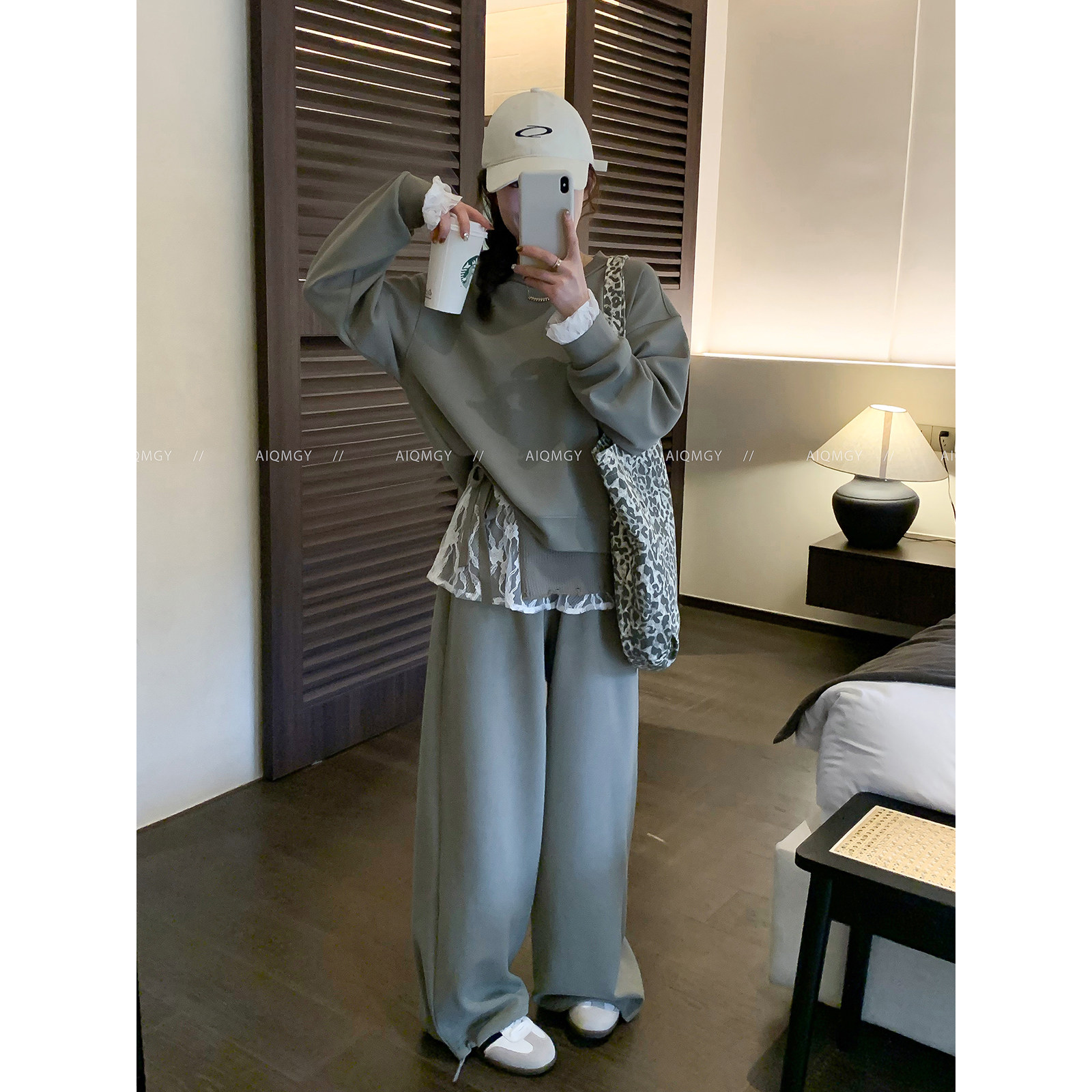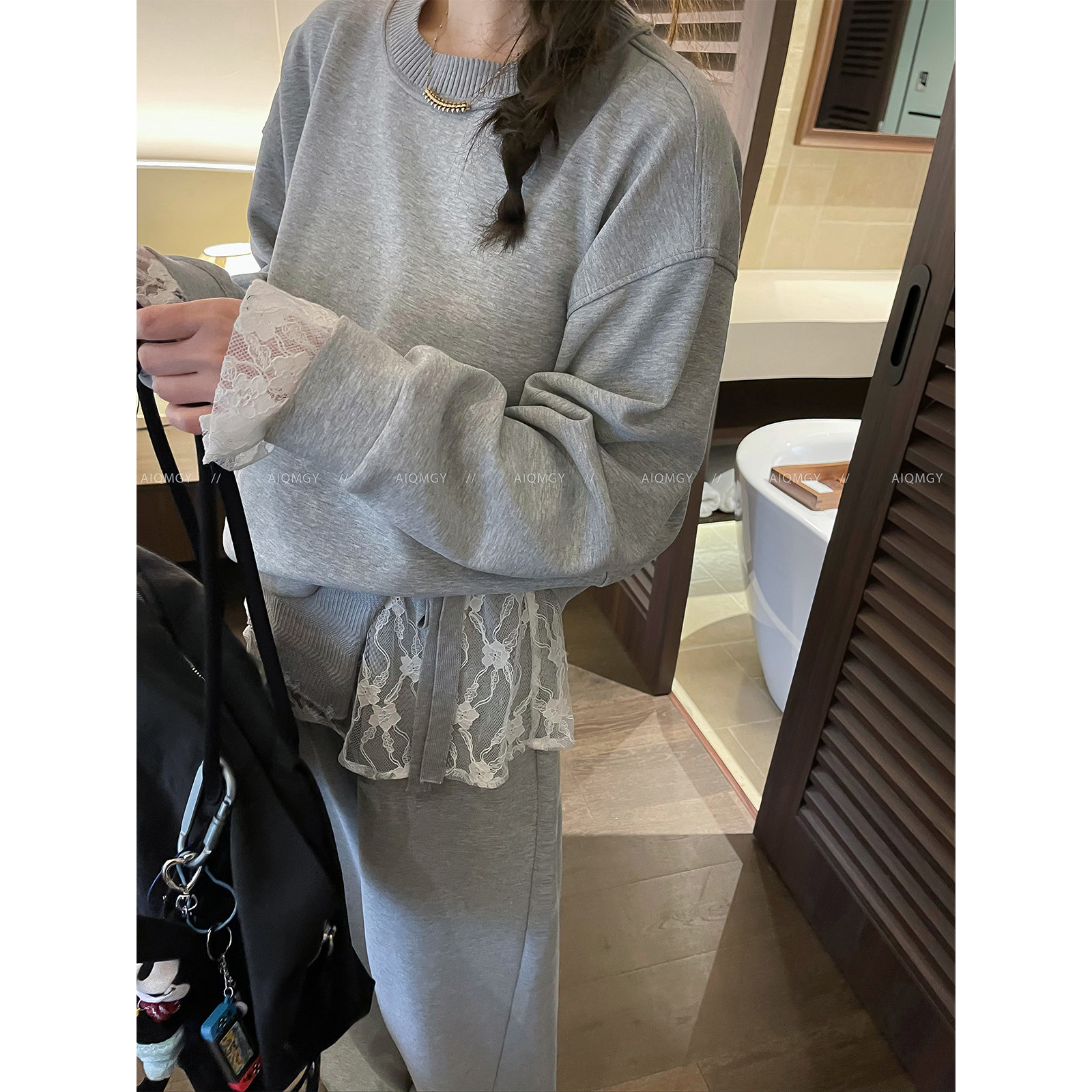 淘宝爱情魔鬼鱼 时尚蕾丝拼接套装女2026春季圆领卫衣宽松卫裤两件套
