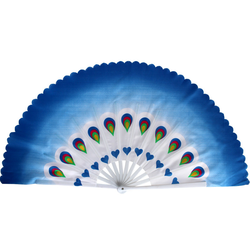 大孔雀扇,又称彩云扇或凤尾扇,是一种专为广场舞和健身舞蹈设计的大号舞蹈扇。其扇面宽大,色彩绚丽,常采用渐变彩条或孔雀羽毛图案,舞动时如彩云翻飞、孔雀开屏,极具视觉美感。扇骨多采用轻便耐用的塑料材质,柔韧不易折断,适合长时间舞蹈动作。大孔雀扇不仅增强了舞蹈的表现力与观赏性,还能锻炼手臂力量与身体协调性,深受中老年健身爱好者喜爱。在广场、公园等场所,舞者手持大孔雀扇翩翩起舞,既愉悦身心,又展现健康活力,成为全民健身的一道亮丽风景。
