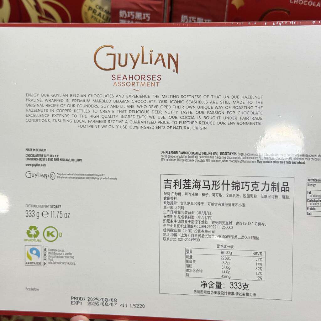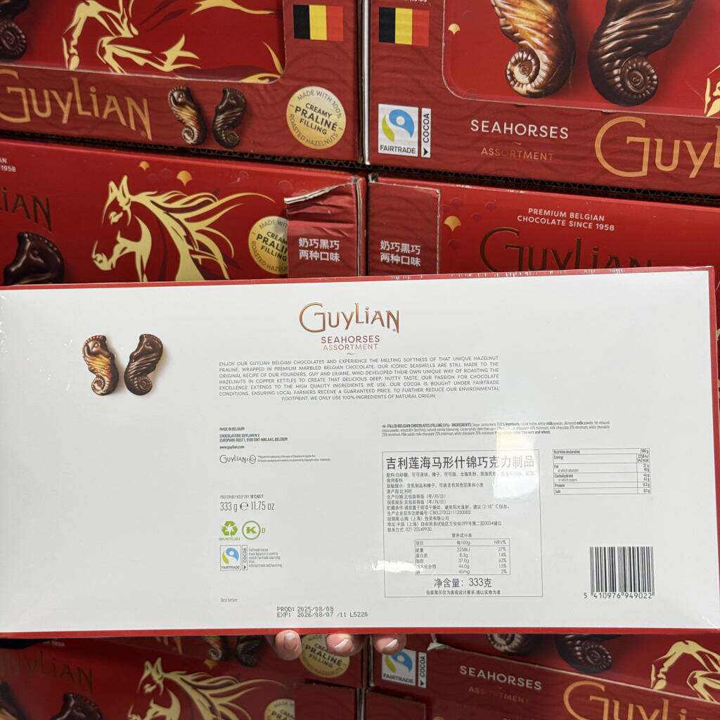 吉利莲海马形什锦巧克力制品,精选比利时进口优质可可,匠心打造独特海马造型,融合丝滑牛奶巧克力、香醇黑巧克力与果仁夹心,口感层次丰富,甜而不腻。333g精美礼盒装,包装典雅大气,尽显高端品质,是新年送礼、节庆年货的理想选择。每一颗巧克力都承载着比利时的传统工艺与浪漫情怀,无论是自用还是馈赠亲友,都能传递浓浓心意与节日祝福。吉利莲,以卓越品质赢得全球信赖,让甜蜜在舌尖绽放,为新年增添一份奢华与温馨。