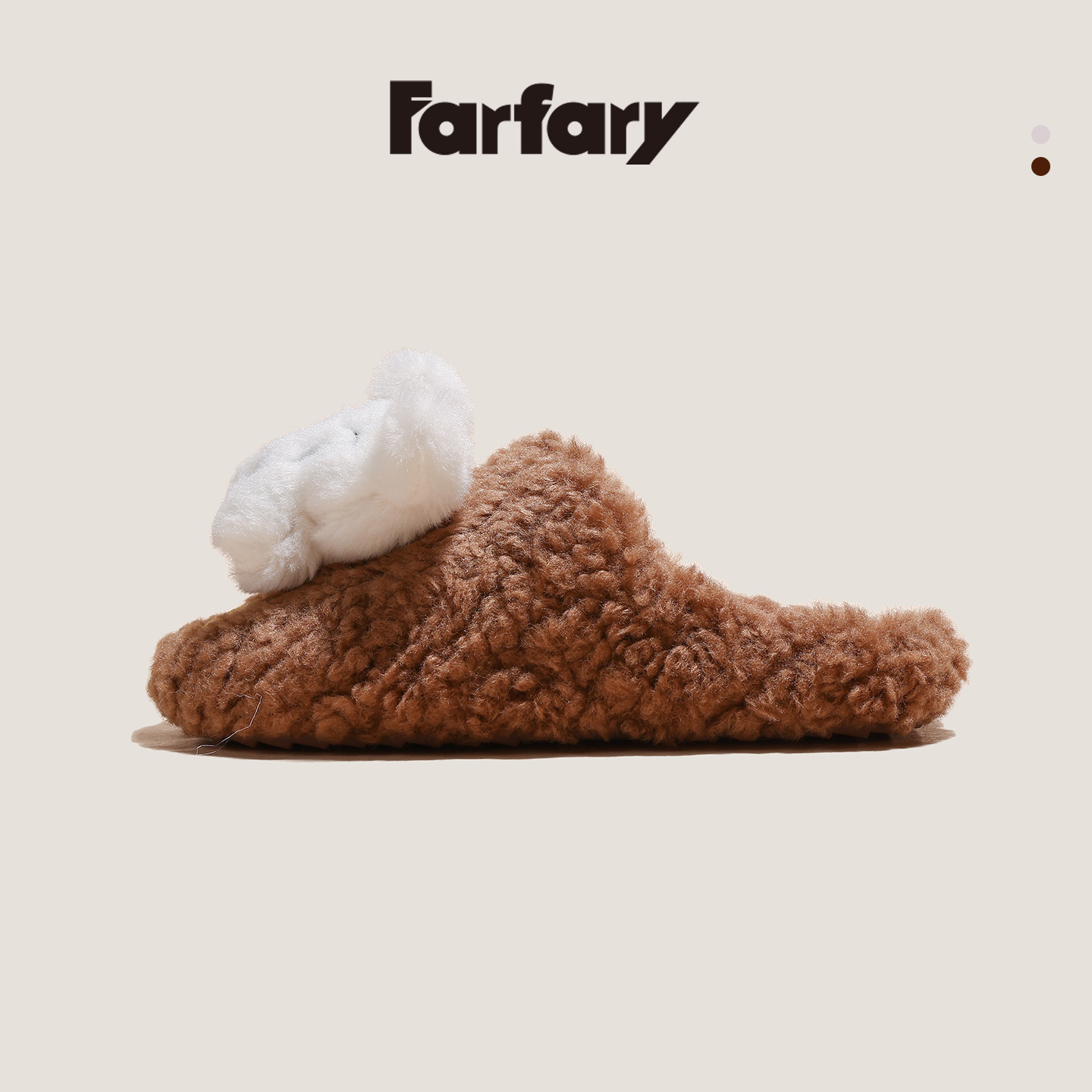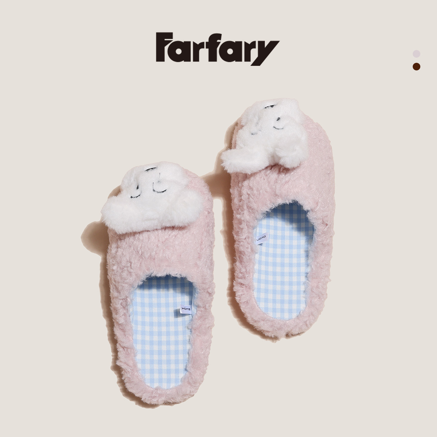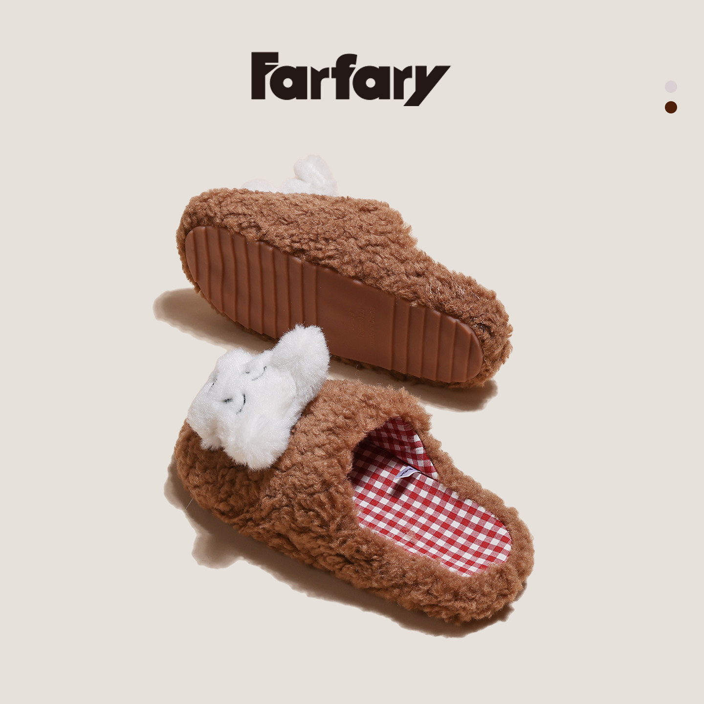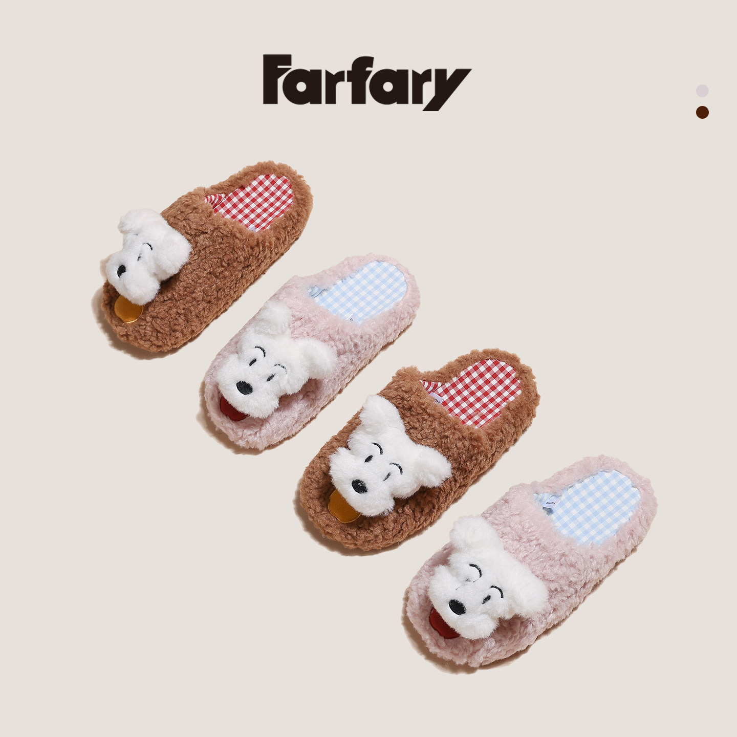 淘宝Farfary番薯泥格子小狗毛绒拖鞋女秋冬卡通家居室内静音毛毛棉拖