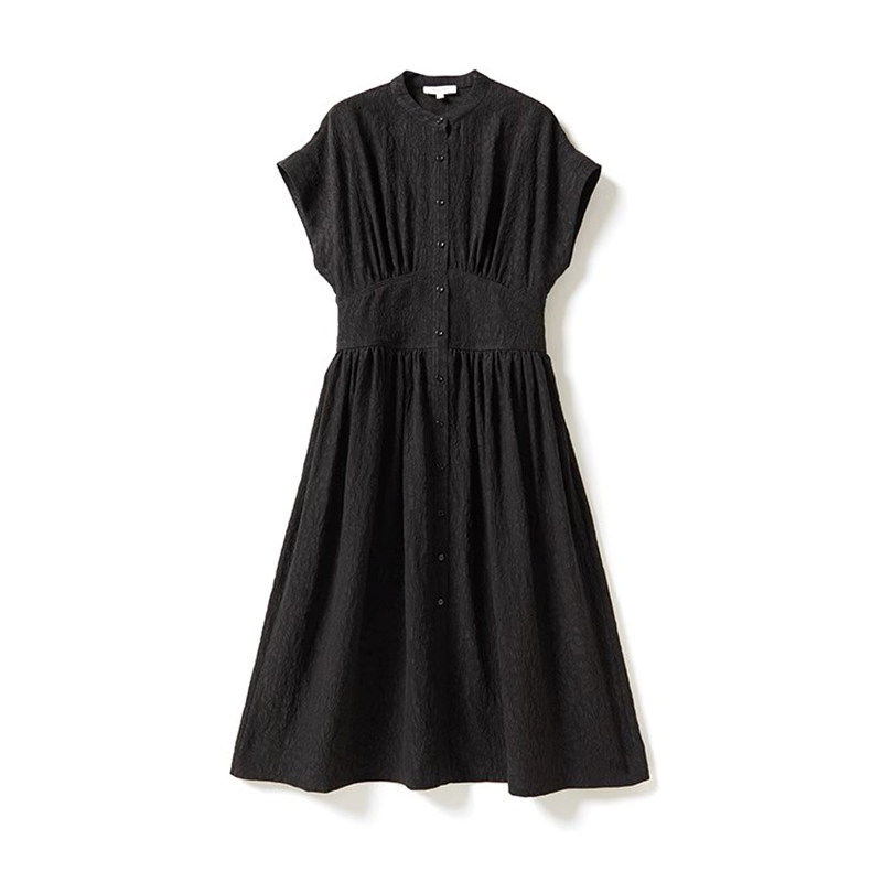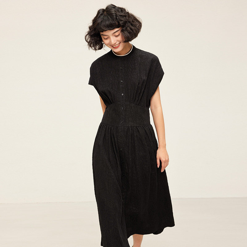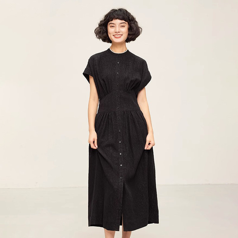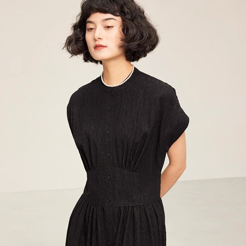 淘宝*WLQ06170 新中式真丝香云纱冠乐绉提花小立领盖袖收腰连衣裙女