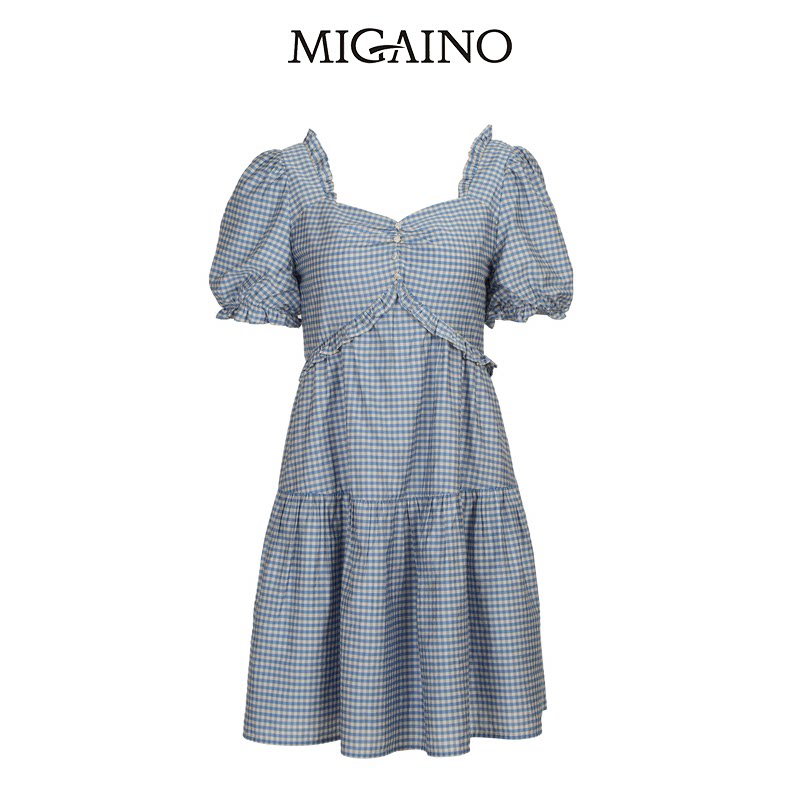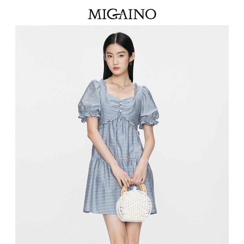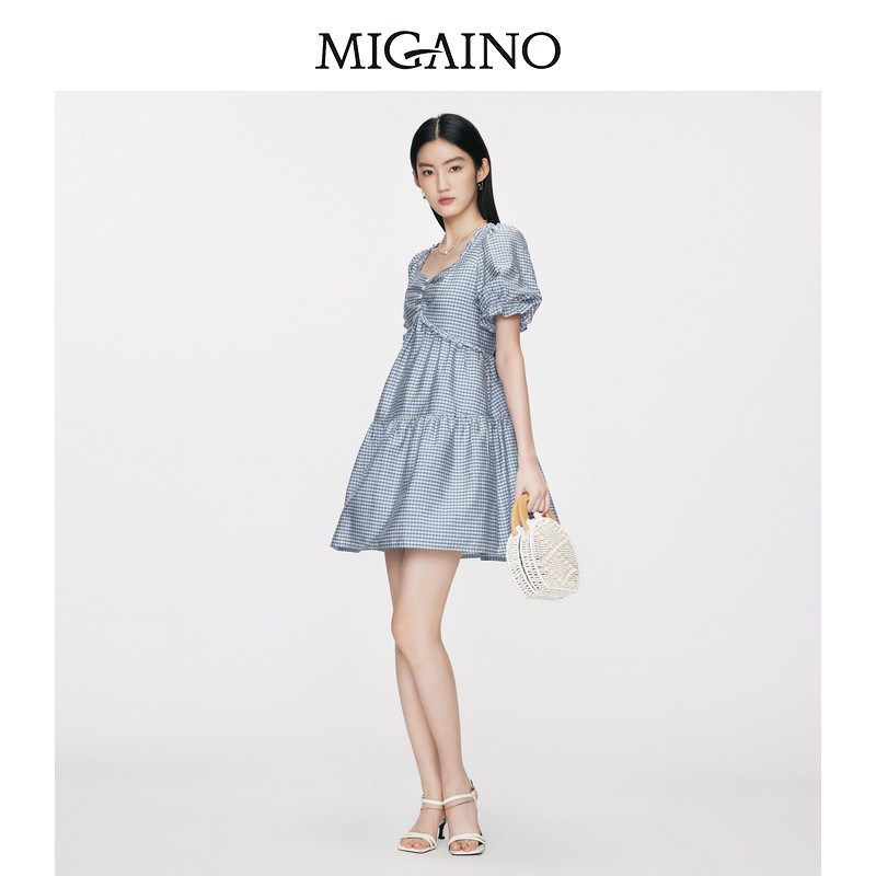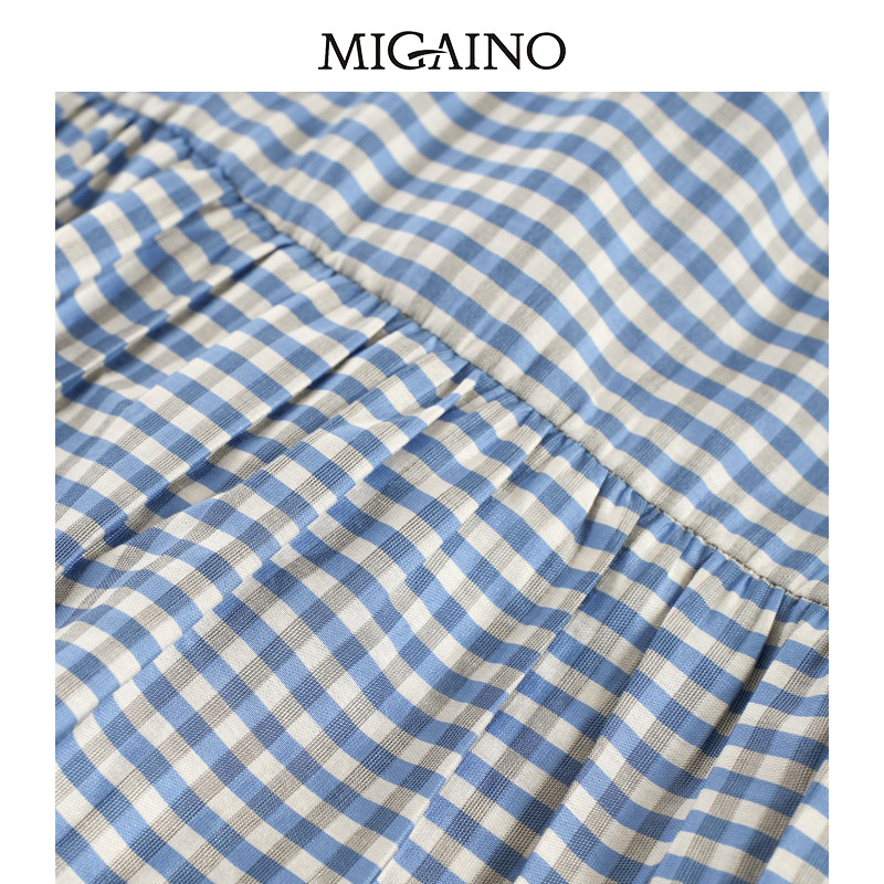 天猫Migaino曼娅奴女装夏季新款小个子时尚气质蓝白格纹连衣裙