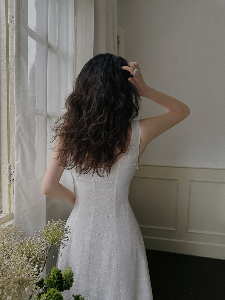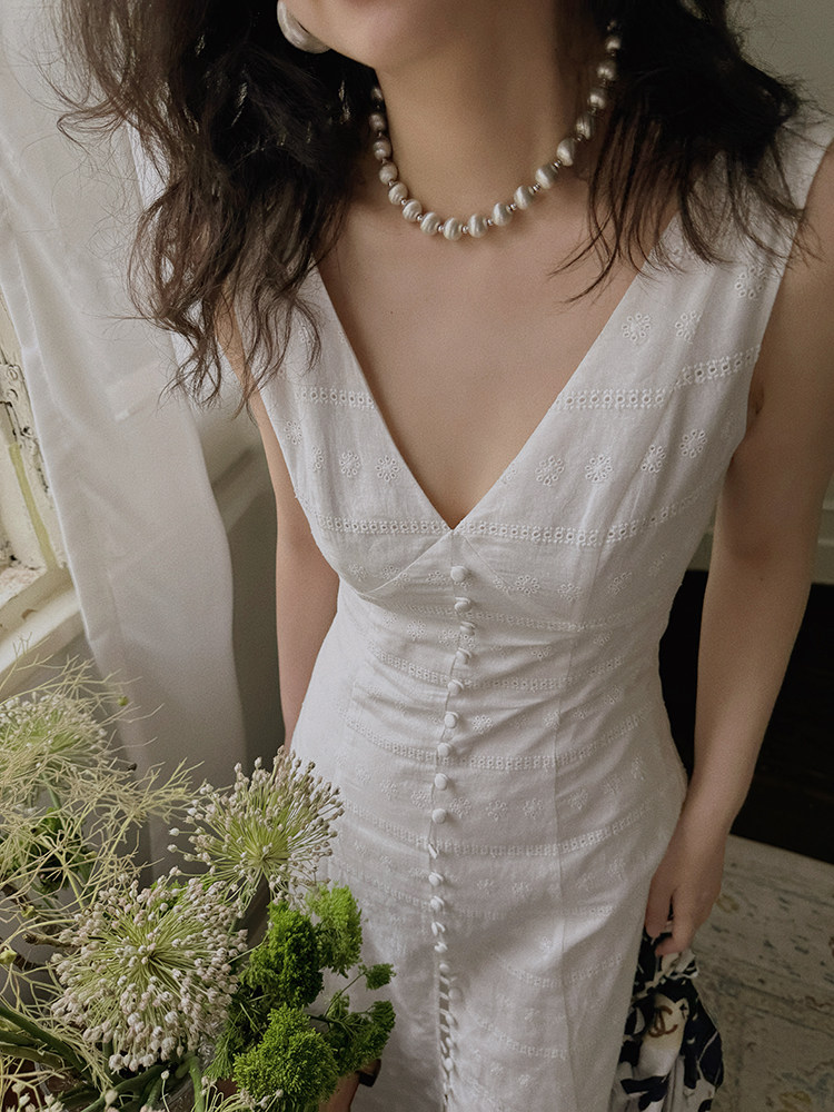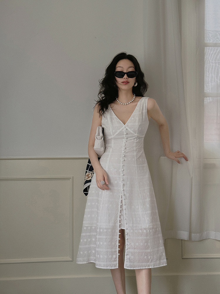 淘宝TOP家 拨动心弦 法式浪漫复古白色纯棉绣花v领无袖收腰连衣裙女夏