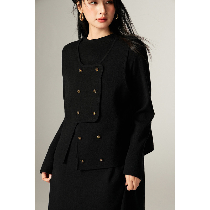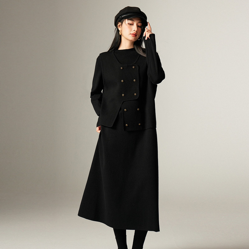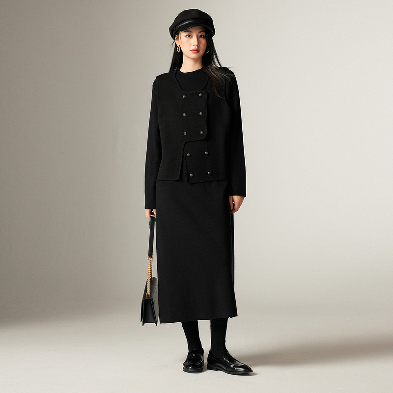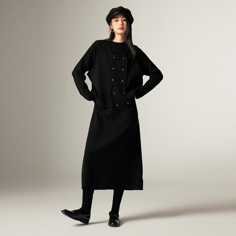 BasicHouse/百家好纯色小香风连衣裙套装,以经典黑色为主调,融合优雅与知性气质,是秋冬衣橱的理想选择。套装包含一件精致针织马甲与一条修身半身裙,采用高品质针织面料,触感柔软,保暖舒适。小香风设计元素如金属扣装饰、利落剪裁,凸显女性干练又不失柔美的风格。马甲可单穿或搭配内搭,裙装高腰设计拉长腿部线条,整体造型简约大方,适合通勤、约会或休闲场合。百搭性强,轻松打造高级质感穿搭,展现低调奢华的时尚品味。
