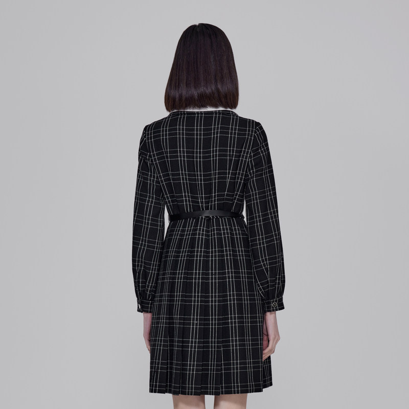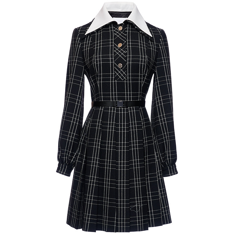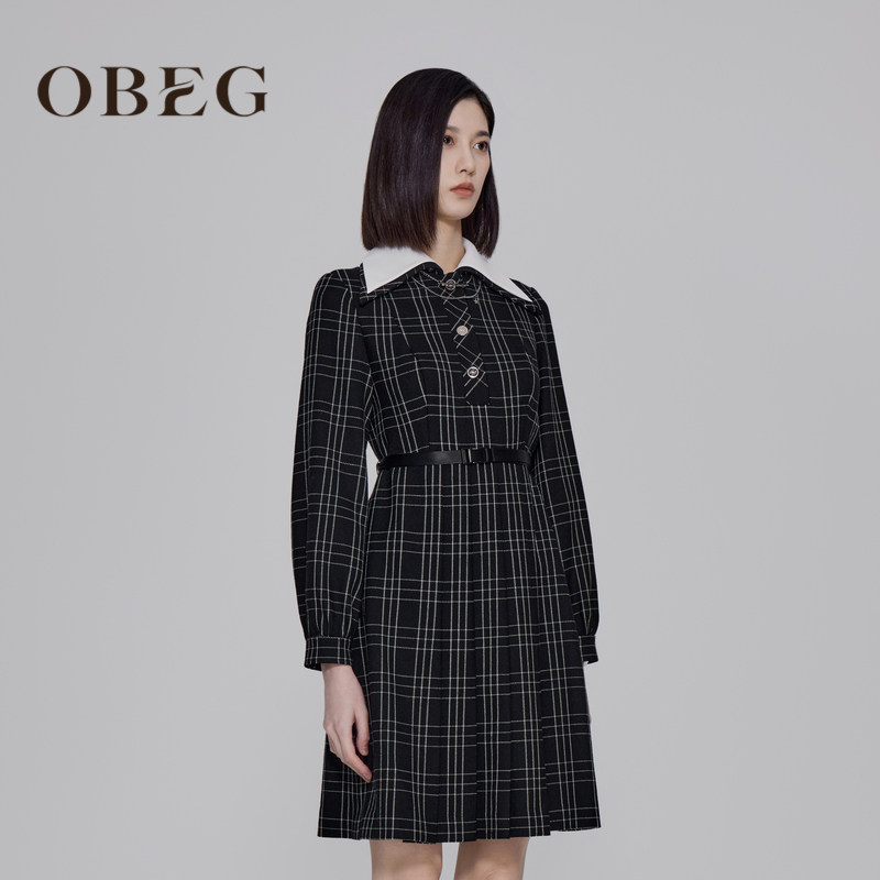 天猫OBEG/欧碧倩秋冬格纹羊毛连衣裙女气质通勤收腰A字裙10443072