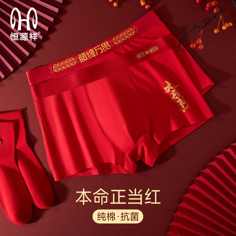 天猫恒源祥本命年男士内裤纯棉平角裤大红色结婚礼物属马男生四角短裤
