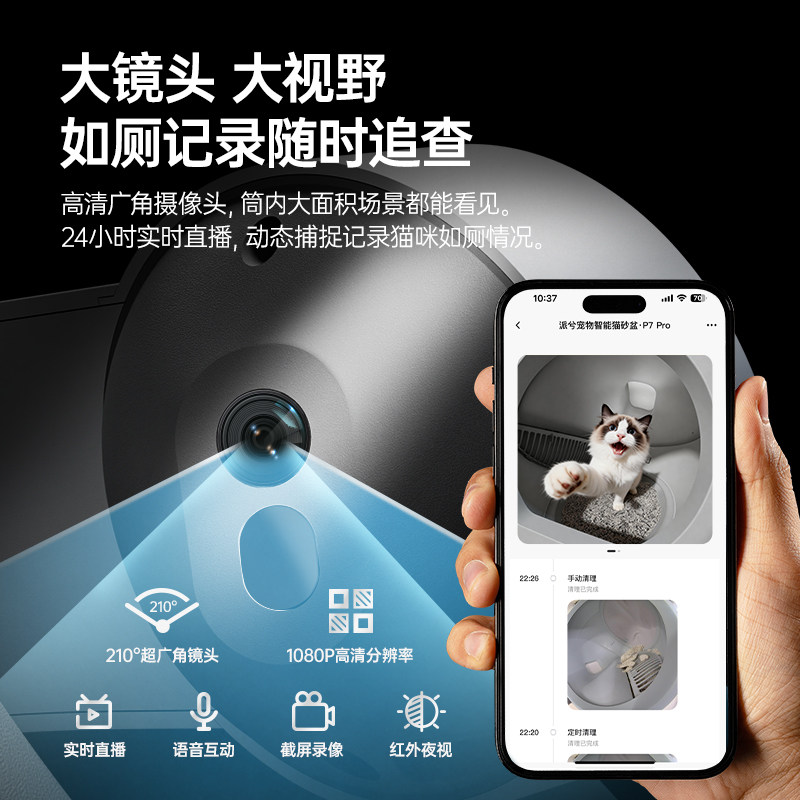 派兮P7全自动猫砂盆是一款搭载5G可视技术的智能猫厕所,专为多猫家庭或大体型猫咪设计。采用超大号空间结构,有效防止猫砂外溅,搭配高效密封系统与活性炭过滤层,强力防臭,保持室内空气清新。内置高清摄像头,支持手机远程实时监控,随时掌握猫咪如厕情况。全自动感应铲屎,无需手动清理,APP智能提醒更换集便仓,操作便捷省心。静音运行设计,不惊扰爱宠,集智能、卫生、安全于一体,是现代养猫家庭的理想之选,让铲屎官彻底解放双手,享受科技养宠新体验。