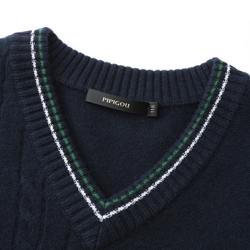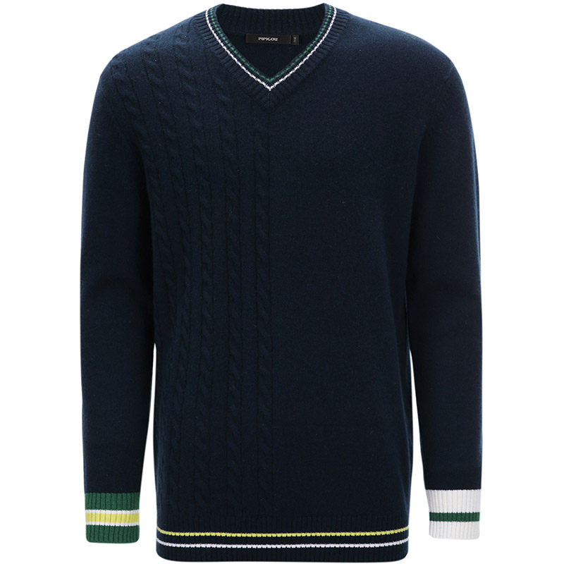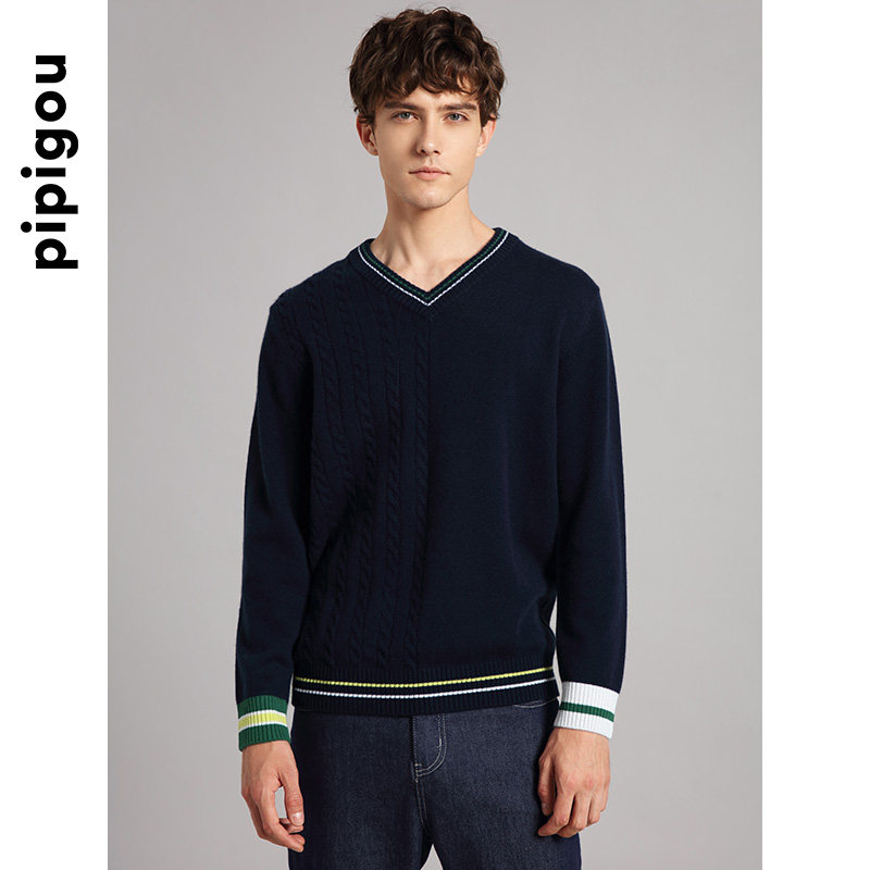 天猫皮皮狗秋冬男士撞色V领绞花休闲宽松羊绒衫套头针织毛衣