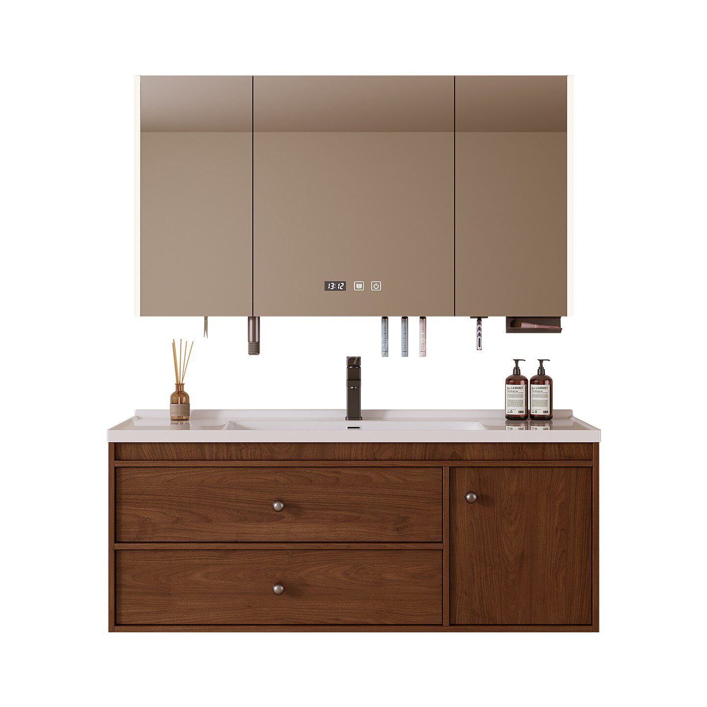 沐枫优家胡桃色中古风实木浴室柜,融合传统中式美学与现代实用设计,精选优质实木打造,结构稳固,防潮耐用。柜体采用温润胡桃木色,纹理细腻,质感高级,搭配陶瓷一体成型盆,无缝易洁,美观又卫生。整体造型简约大气,线条流畅,既保留古典韵味,又契合当代家居风格。抽屉与柜门储物空间合理,满足日常收纳需求。适用于干湿分离卫生间,提升空间格调与实用性,是追求品质生活的理想之选。安装便捷,环保健康,为您打造舒适雅致的洗漱体验。