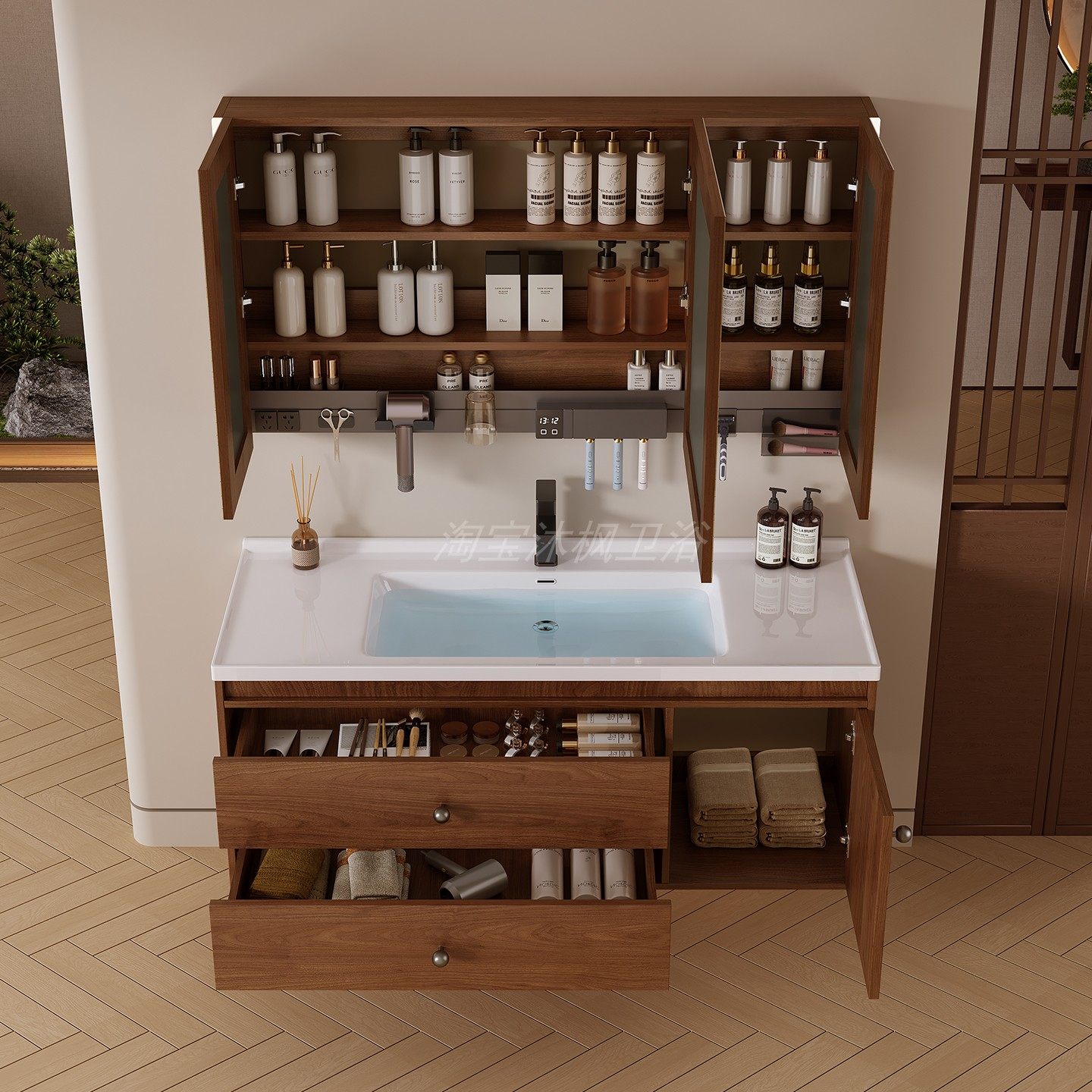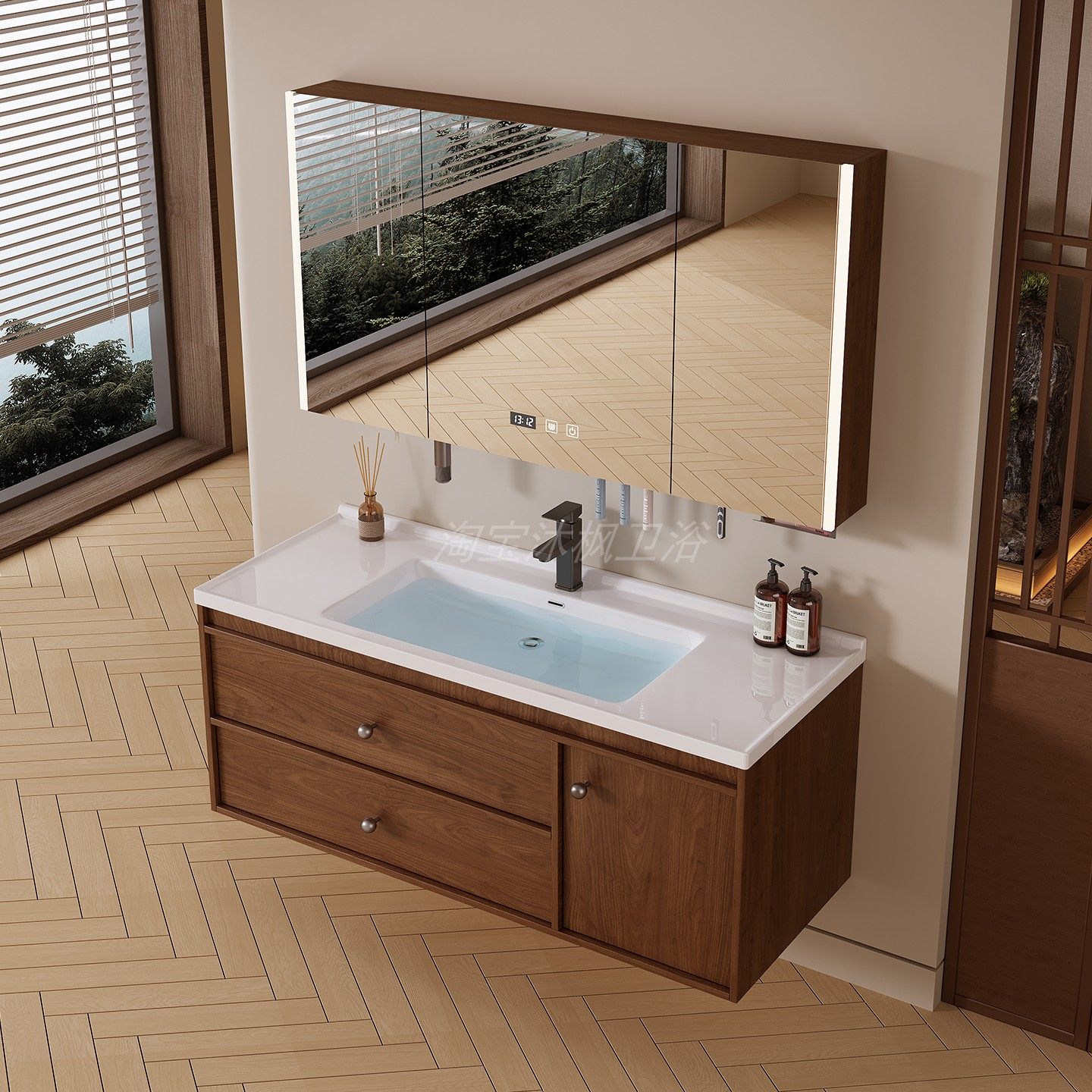 淘宝沐枫优家胡桃色中古风实木浴室柜陶瓷一体盆卫生间洗手盆洗脸盆柜