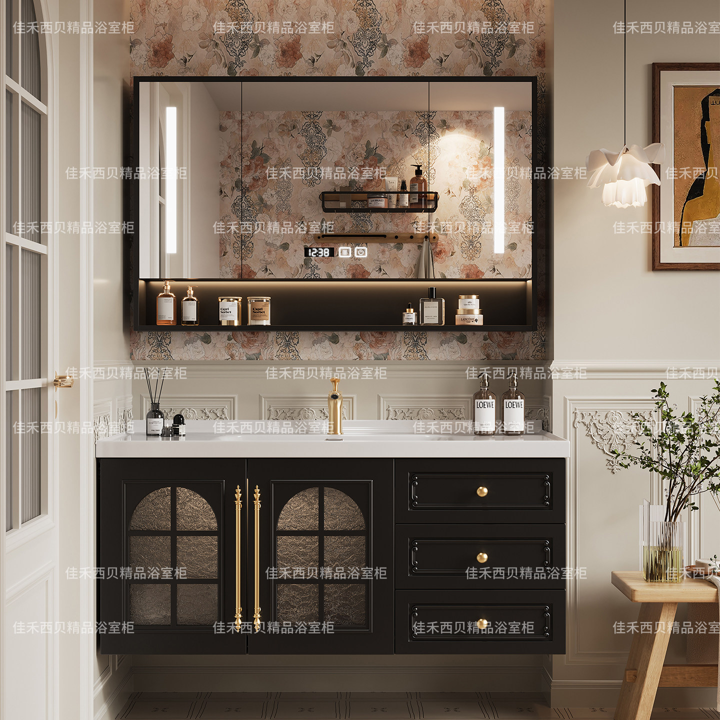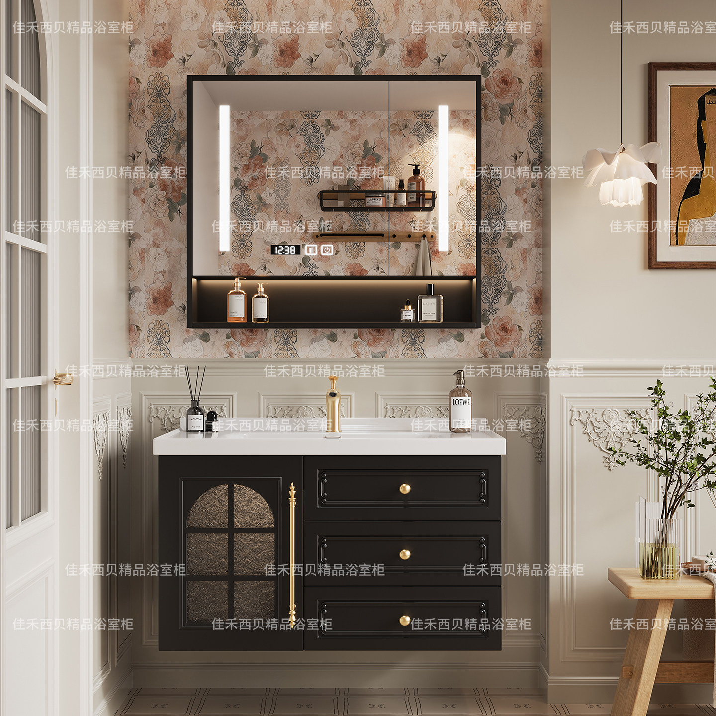 这款法式复古浴室柜组合将经典美学与现代实用完美融合,采用优质实木打造柜体,结构稳固、防潮耐用,表面经精细打磨与复古涂装,呈现优雅做旧质感。搭配陶瓷一体成型面盆,线条流畅、易清洁,触感温润细腻。整体设计融入轻奢元素,雕花细节与金属拉手相得益彰,彰显法式浪漫与精致格调。洗漱台空间布局合理,储物功能强大,满足日常收纳需求。无论是复古风格还是现代轻奢卫浴空间,都能轻松提升整体格调,带来舒适优雅的洗漱体验,是品质生活的理想之选。