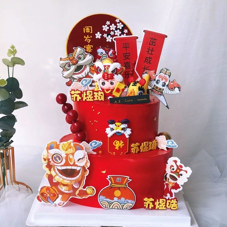 淘宝中式宝宝宴蛋糕装饰摆件宝贝生日周岁满月喜庆舞狮风筝冰糖葫芦插