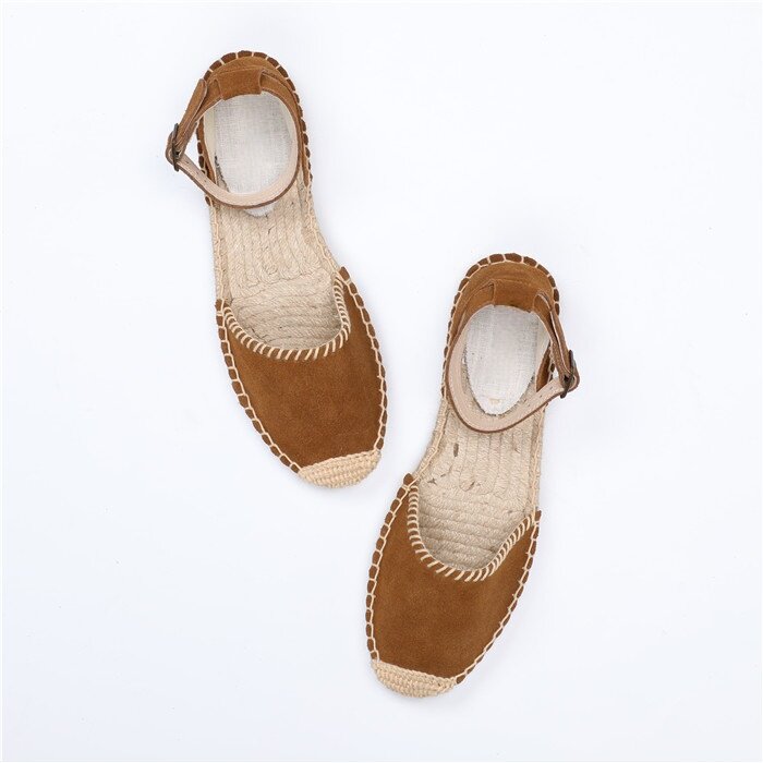 淘宝新款罗马风格扣带真皮平底麻底渔夫鞋包头纯色百搭女凉鞋吸汗透气