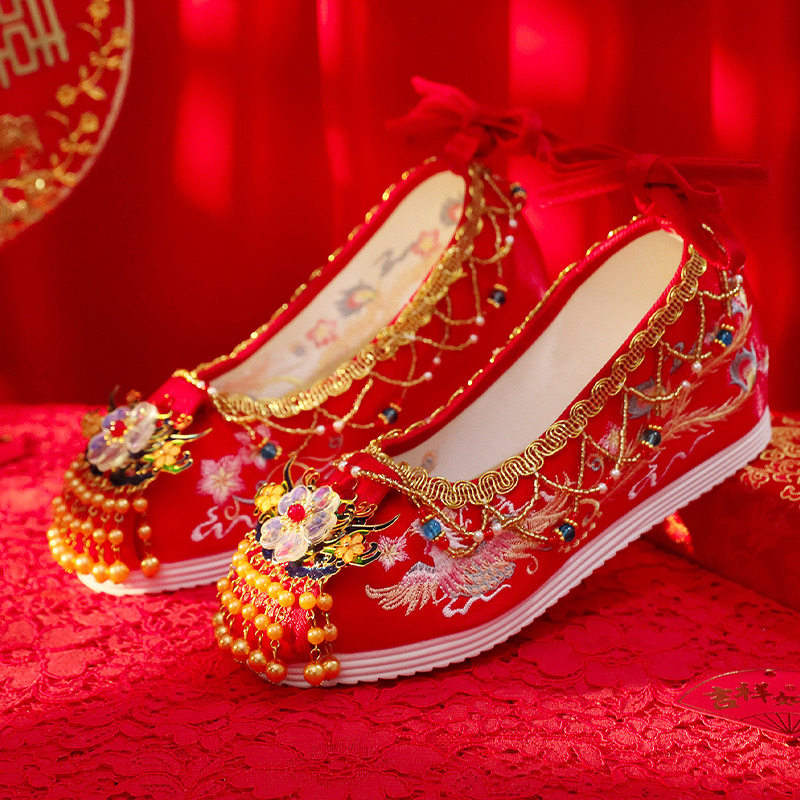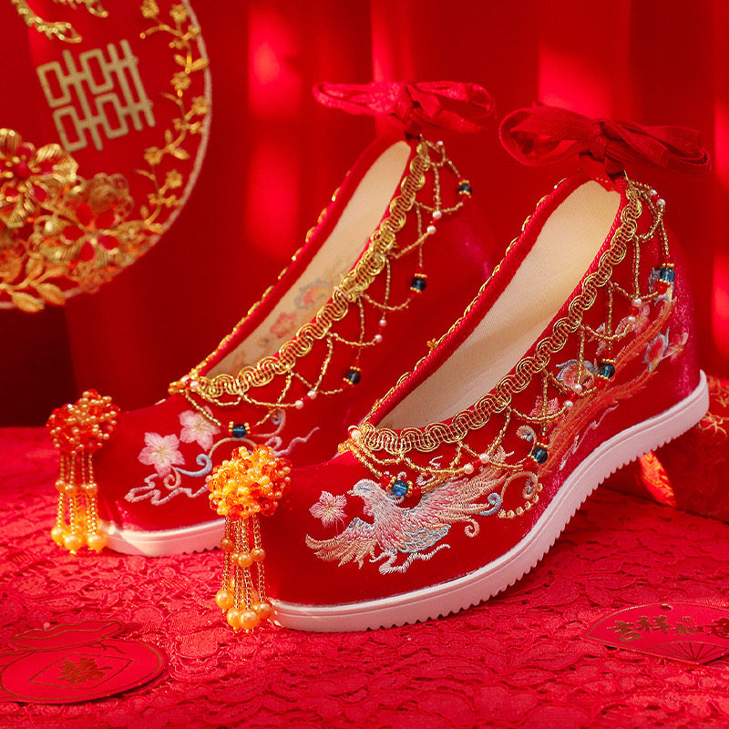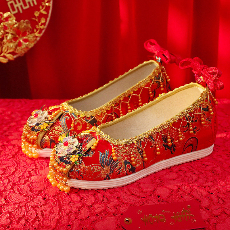 中式秀禾婚鞋汉服婚鞋凤冠霞帔新娘鞋内增高红串珠流苏绣花明宋制