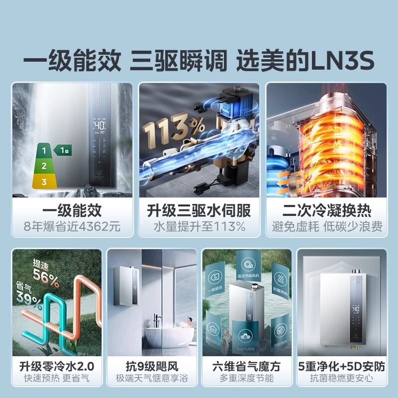 美的超一级能效燃气热水器LN3S,16升大容量设计,满足全家多点用水需求。搭载零冷水技术,开机即享热水,告别等待,提升洗浴舒适度。采用全密闭燃烧系统和智能恒温科技,精准控温±0.5℃,水温稳定不忽冷忽热。超一级能效认证,热效率高达100%以上,节能省气更环保。支持Wi-Fi智控,可通过手机远程预约热水、调节温度,便捷智能。内置多重安全保护,包括防冻、防倒风、熄火保护等,使用更安心。静音运行设计,低噪不打扰。适用于天然气气源,是追求高效节能与舒适体验家庭的理想之选。