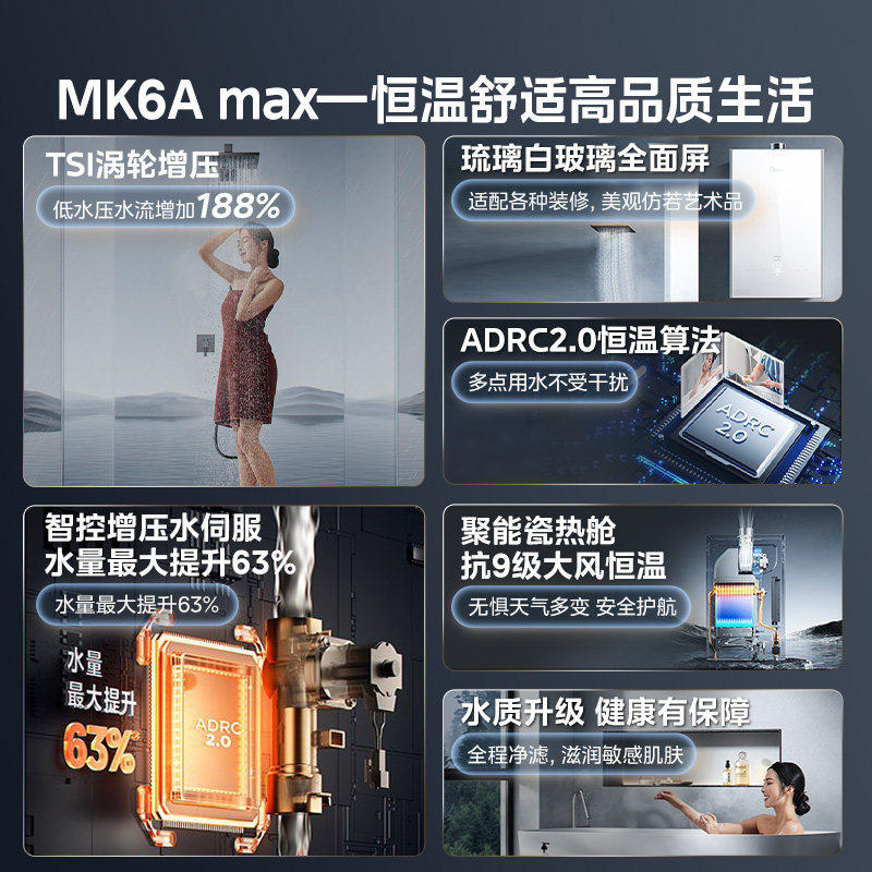 美的燃气增压热水器MK6Amax 16L是一款集零冷水、恒温水伺服技术于一体的高端家用热水器。搭载MK9S智能恒温系统,精准调控水温,实现±0.5℃恒温沐浴体验,告别忽冷忽热。采用天然气作为能源,高效节能,16L大容量满足全屋多点用水需求。内置增压技术,低水压环境也能稳定运行,尤其适合高层住宅。零冷水功能通过循环预热,即开即热,节省等待时间。配备多重安全防护,包括防冻、防CO超标、防干烧等,使用更安心。简约触控面板,操作便捷,支持智能预约与远程控制。整体设计兼顾性能与品质,为现代家庭提供舒适、安全、节能的热水解决方案。