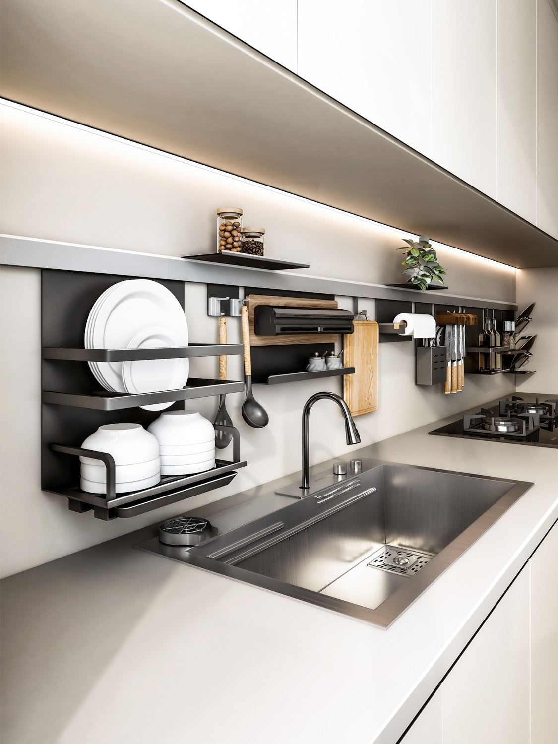 这款黑色太空铝墙上厨房置物架是一款实用的厨房挂件,包括调味料架、壁挂刀架和厨卫挂杆套装。其采用高品质的太空铝材料,具有耐腐蚀、防锈、承重力强的特点,可长时间使用而不易损坏。置物架设计简洁大方,黑色外观时尚美观,易于搭配各种厨房装修风格。同时,它还具有良好的悬挂功能,可以方便地挂置各种厨房用品,让您的厨房更加整洁、有序。是一款实用又美观的厨房收纳必备品。