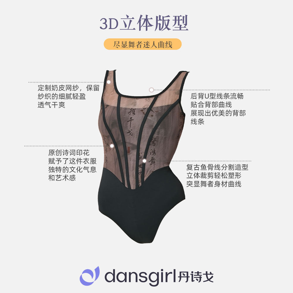 丹诗戈芭蕾舞蹈形体服专为成人女性设计,融合专业练功需求与优雅美感。采用高品质弹性面料,贴合身形,提供舒适支撑与自由伸展空间。独特腰线拼接设计,搭配精致网纱印花背心,既凸显女性柔美曲线,又增添视觉层次感。背部镂空与网纱元素相得益彰,轻盈透气,适合长时间训练。整体剪裁符合人体工学,兼顾功能性与时尚感,适用于芭蕾、形体训练及舞蹈课程。丹诗戈以匠心工艺打造每一件练功服,助力舞者在练习中展现自信与魅力,是追求品质与美感的舞者理想之选。