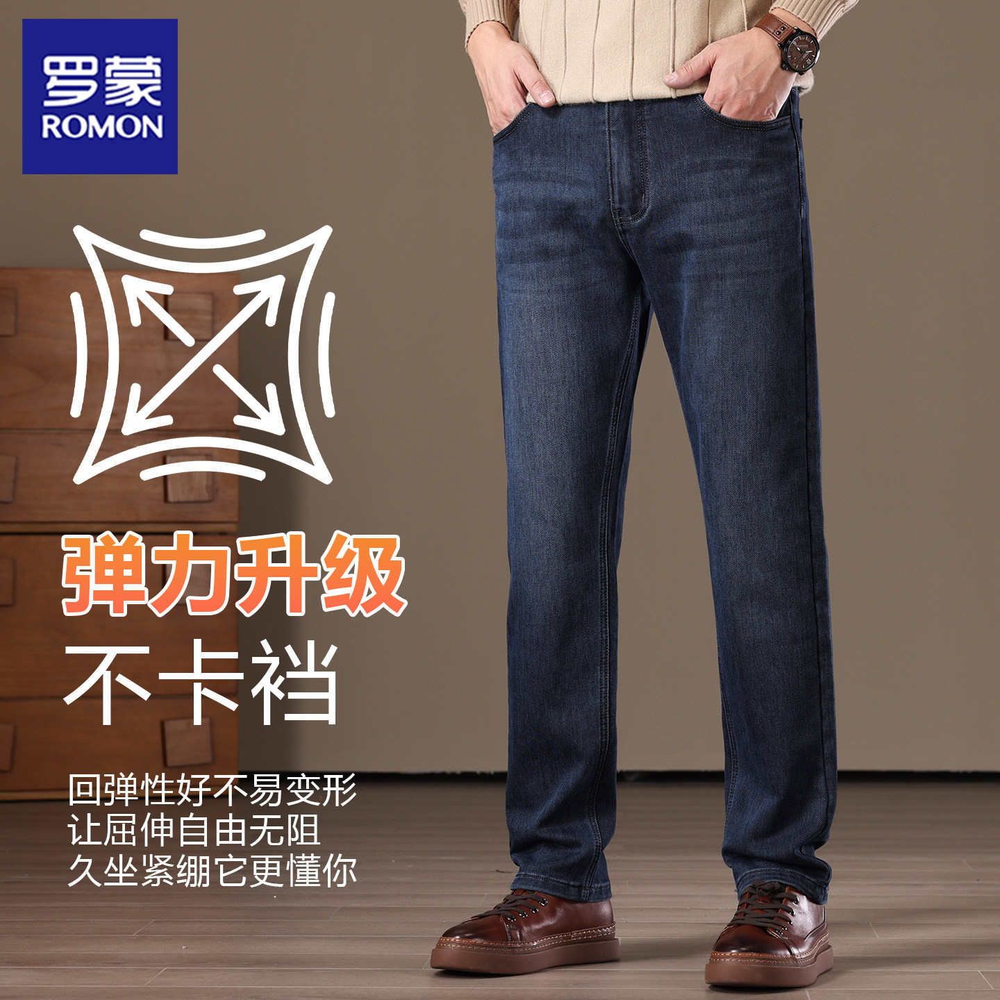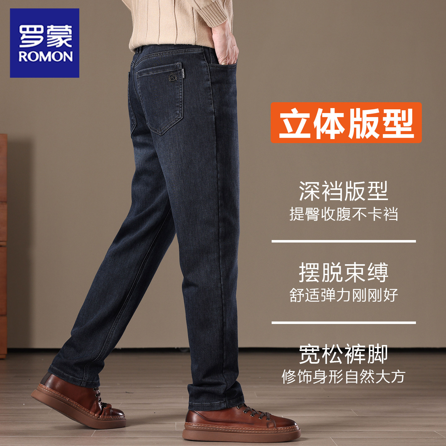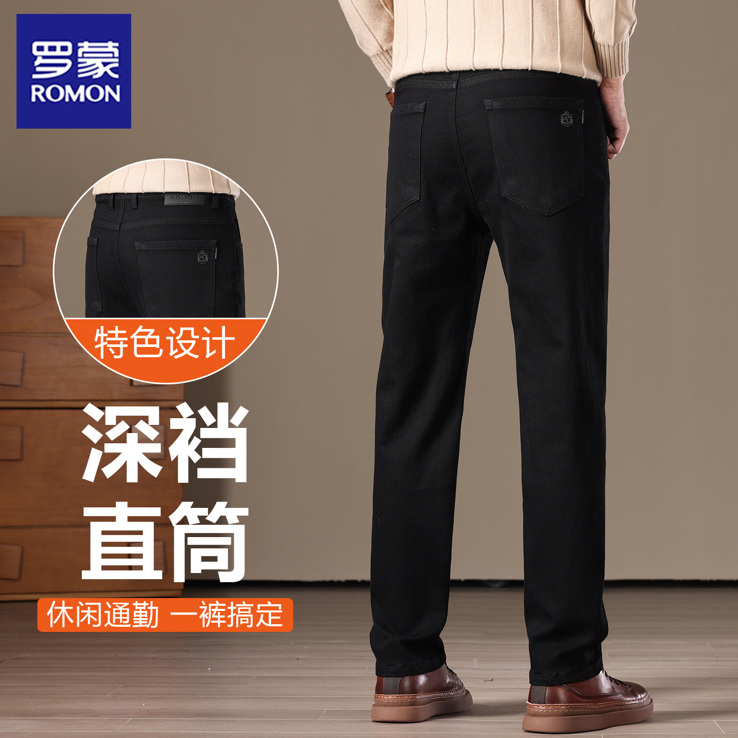 淘宝罗蒙春秋季牛仔裤男士纯黑色宽松直筒弹力商务休闲高腰深裆爸爸裤