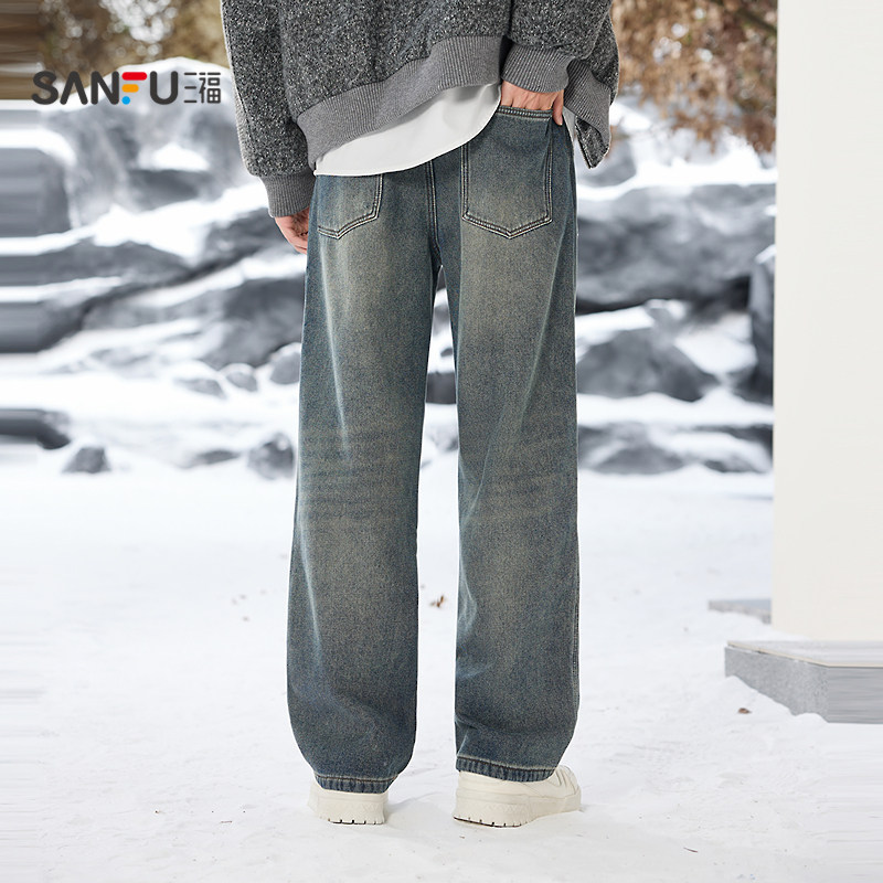 准者直筒牛仔裤男士春季新款加绒保暖复古潮流运动宽松通勤长裤子