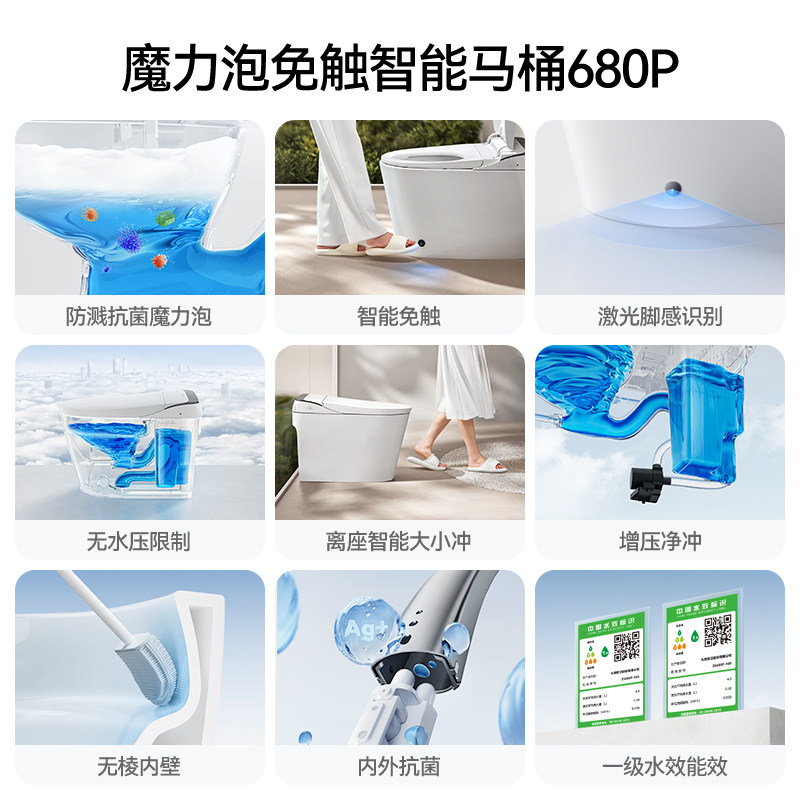 九牧智能马桶680U是一款集科技与健康于一体的智能坐便器,搭载零压脚感翻圈技术,无需弯腰即可自动感应开合座圈,使用更便捷。全水路UVC紫外线杀菌系统,有效杀灭水路及内壁细菌,保障用水洁净,守护家人健康。产品支持即热恒温、暖风烘干、座圈加热等多重舒适功能,提升如厕体验。现享受政府节能补贴政策,购机更实惠,助力绿色家居升级。九牧680U以创新科技诠释智能卫浴新标准,是追求品质生活家庭的理想之选。