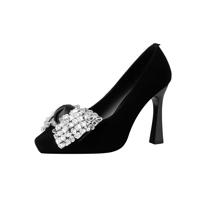 天猫蝴蝶结水钻绒面单鞋尖头时尚女鞋2025秋季新款浅口高跟鞋一脚蹬