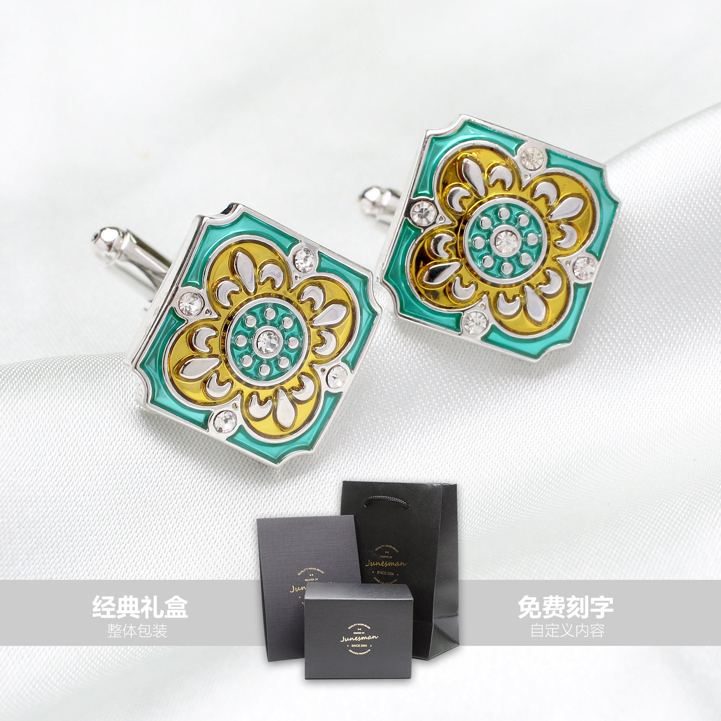 细釉珐琅彩男士商务袖扣,融合法式优雅与现代工艺,精选优质合金材质,表面采用高温细釉珐琅工艺,色彩饱满、光泽温润,久用不褪色。精巧设计搭配立体雕花与细腻纹理,彰显低调奢华品味。适用于正式场合或商务着装,轻松提升衬衫整体质感。六月男人系列注重细节与实用性,袖钉结构稳固,佩戴便捷,是精英男士彰显格调的理想配饰。无论是会议、晚宴或重要约会,这款珐琅彩袖扣都能为造型增添一抹精致亮点,诠释成熟男士的优雅与自信。