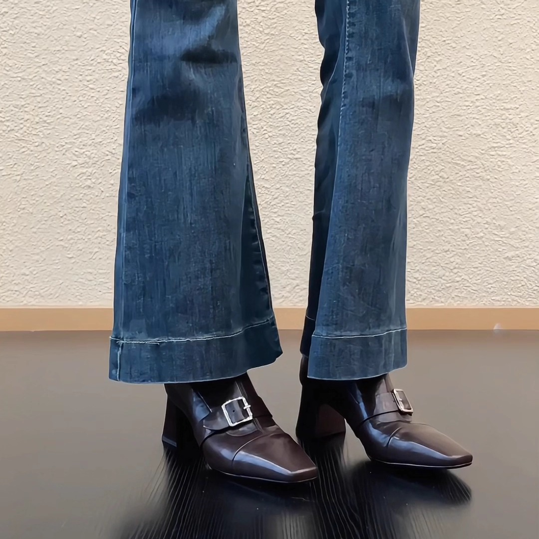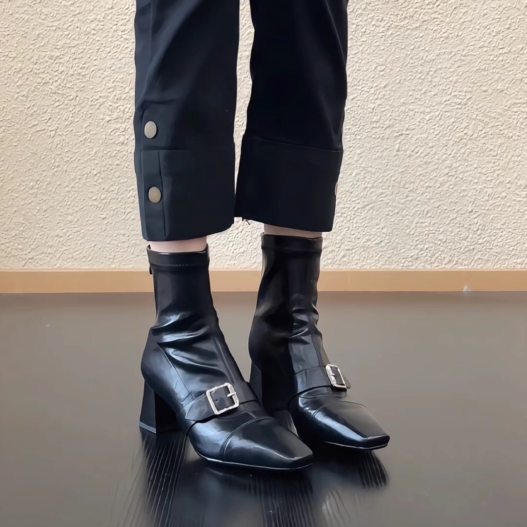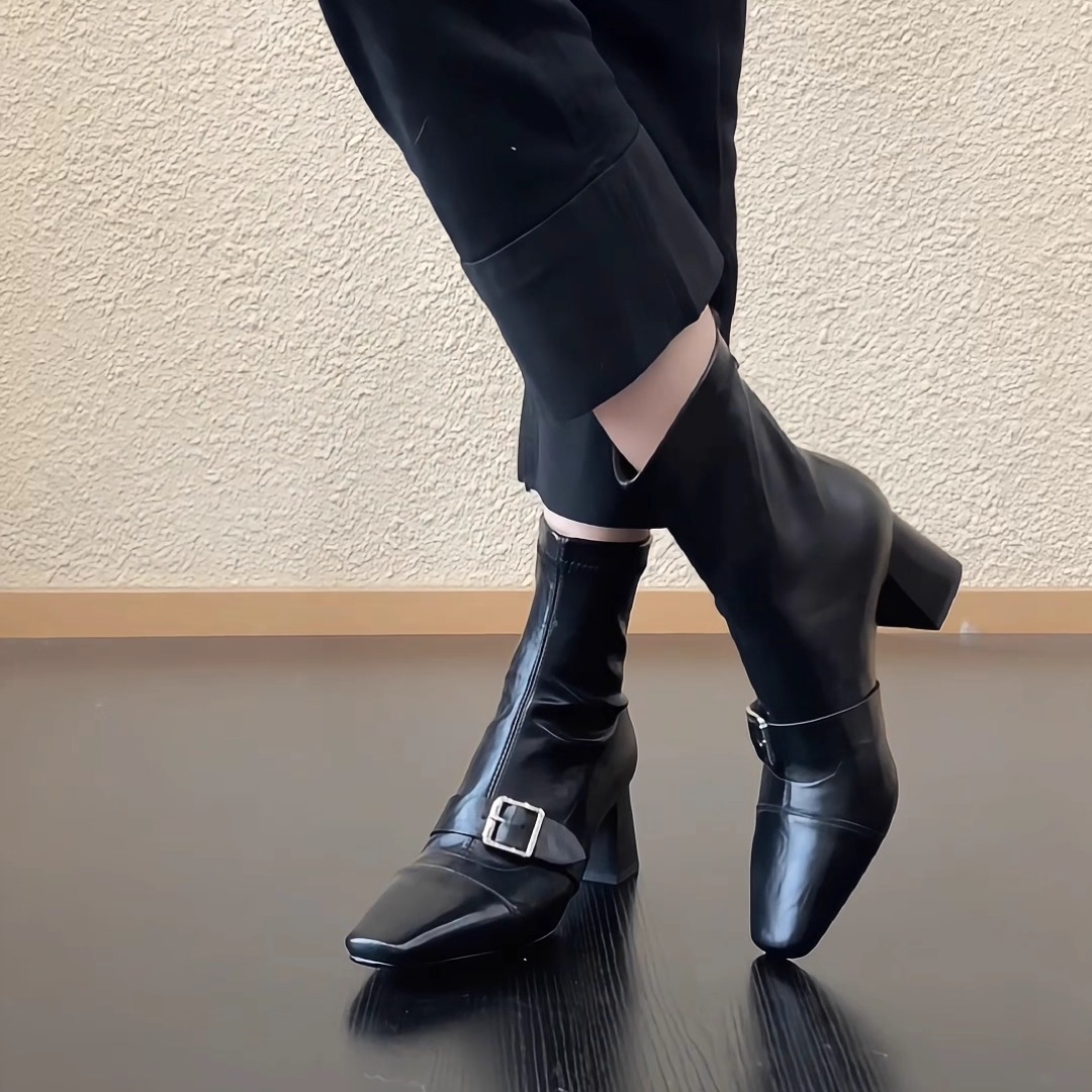 淘宝RubyL/6cm小个子高跟短靴简约方头皮带扣职场粗跟弹力瘦瘦靴