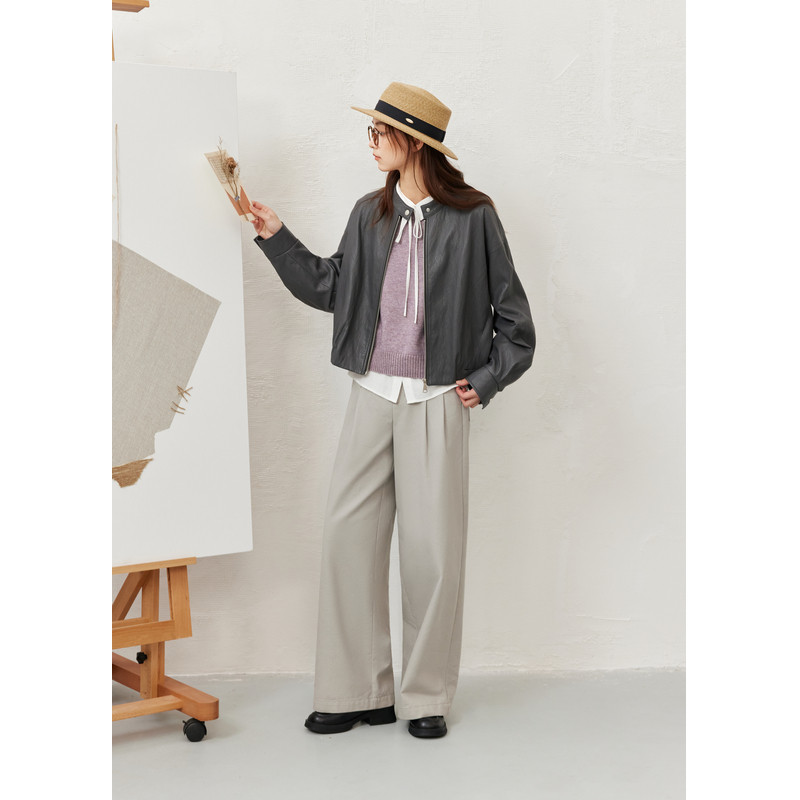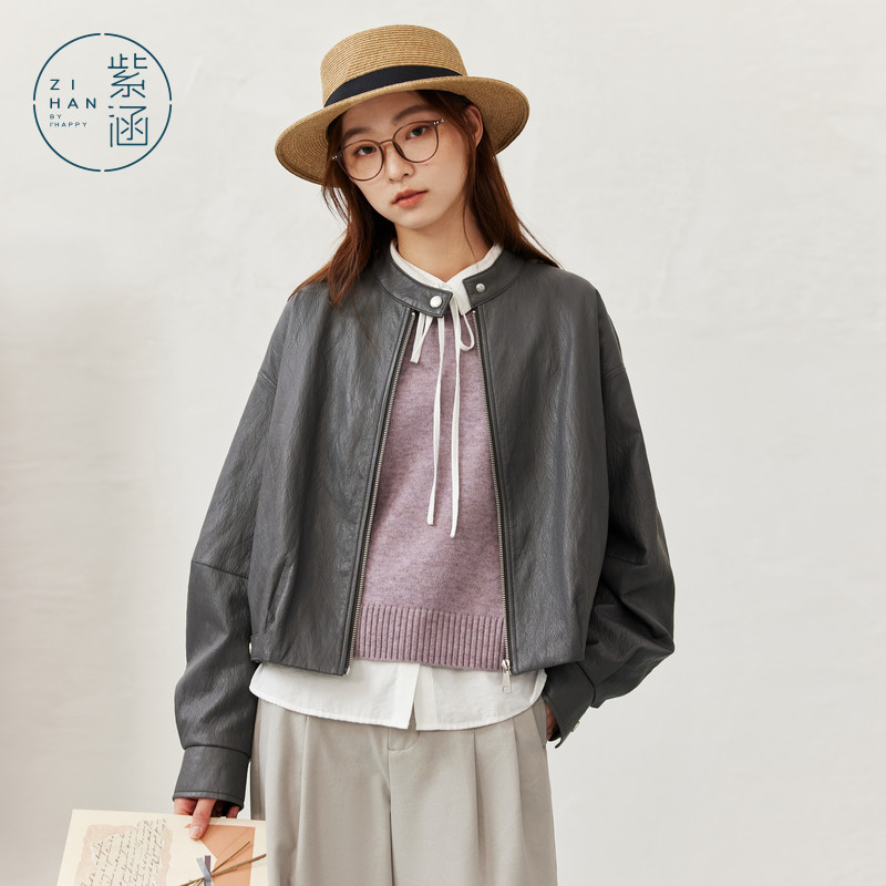 天猫紫涵短款灰色立领皮衣外套女秋季新款复古微褶肌理感拉链夹克上衣