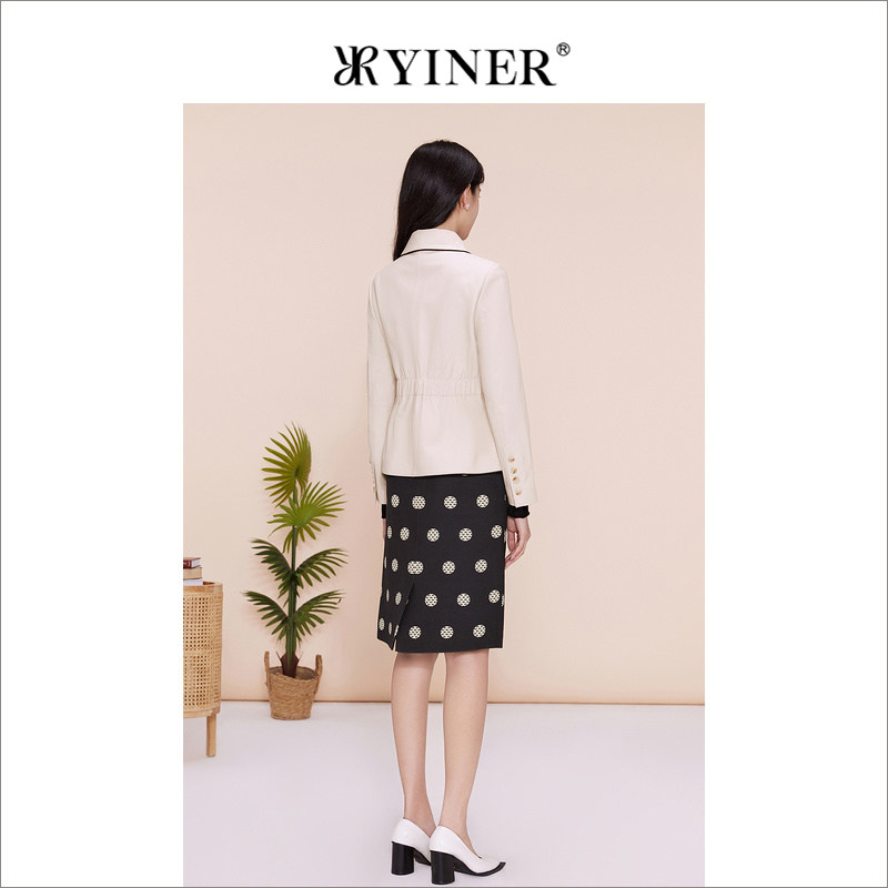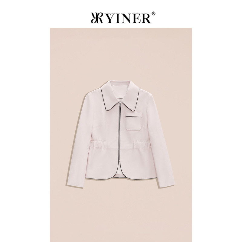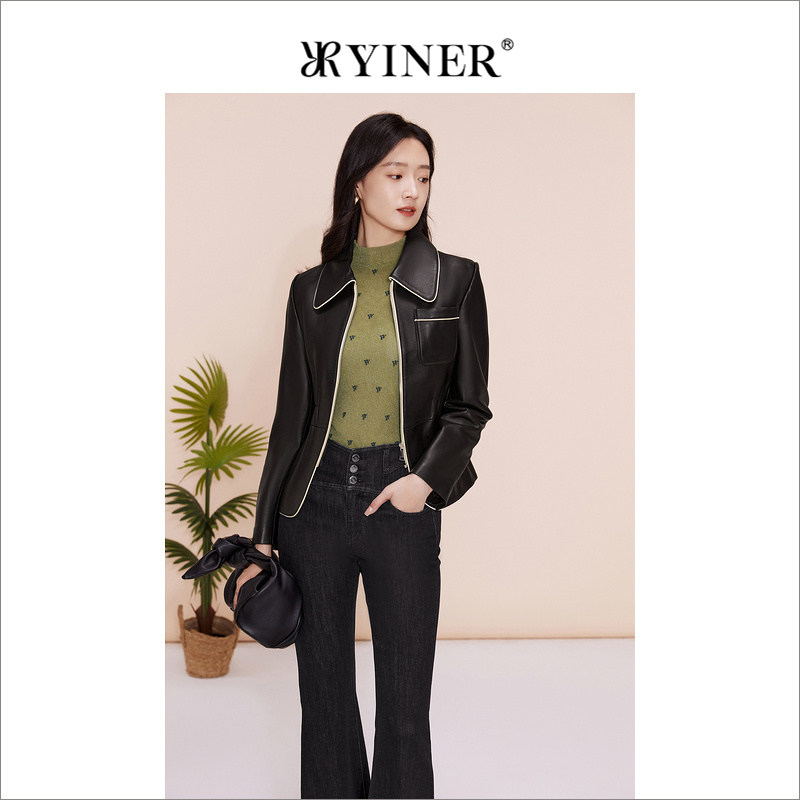 天猫YINER音儿专选女装春季撞色包边POLO领绵羊真皮皮衣夹克外套