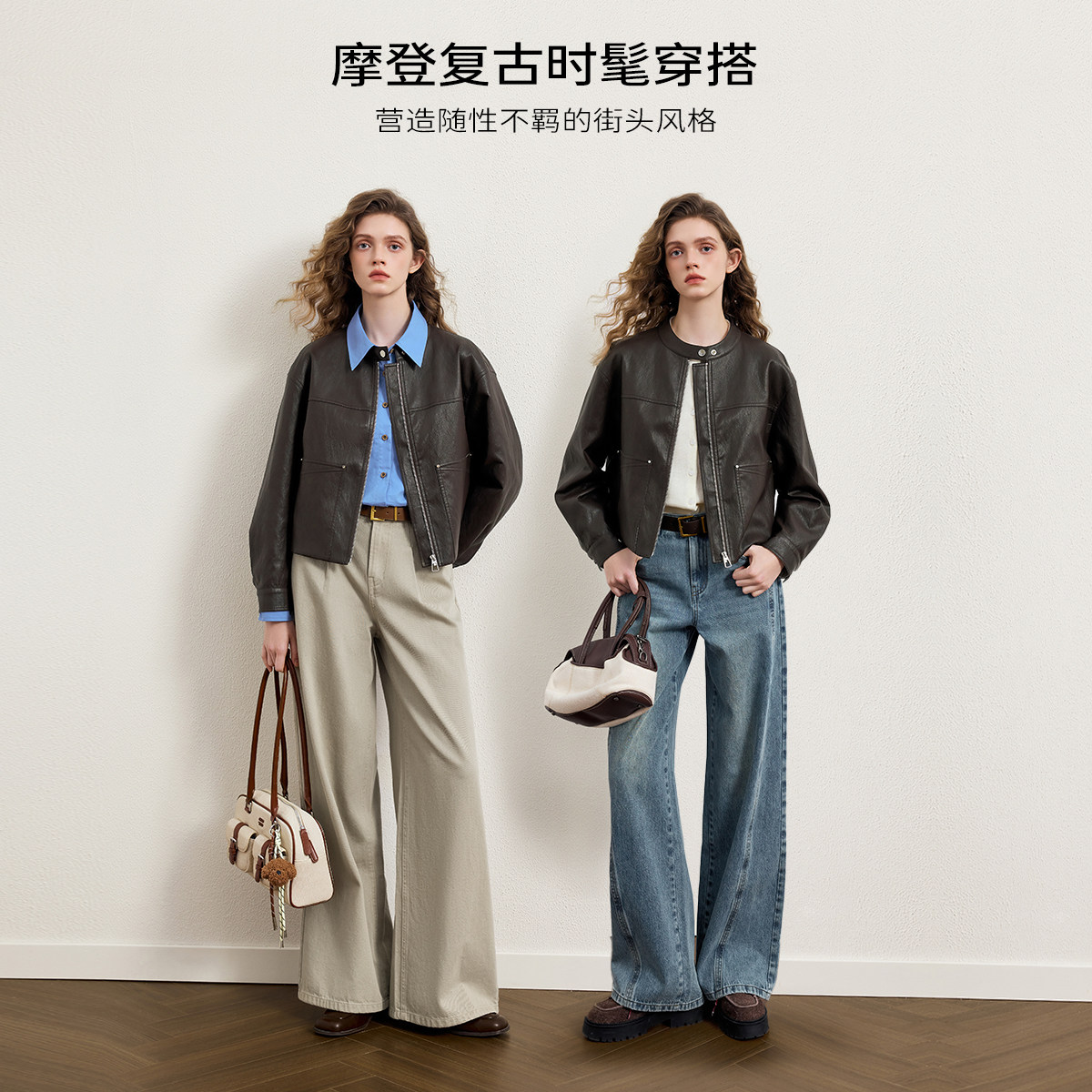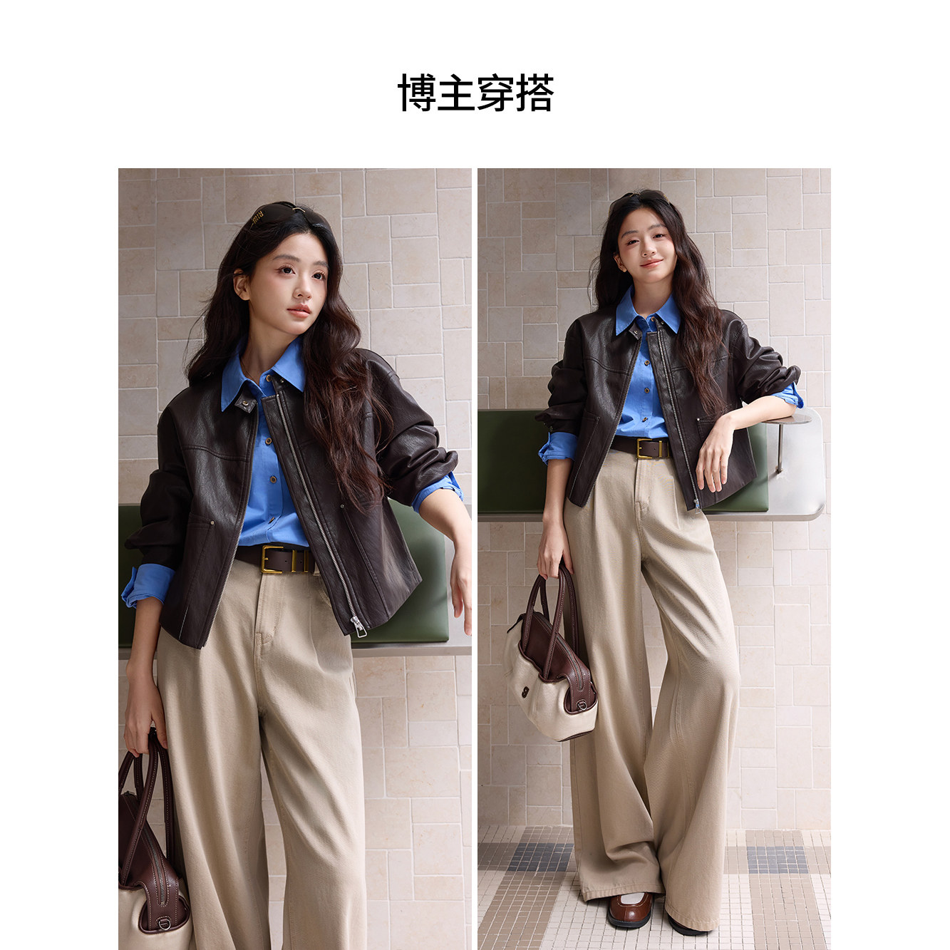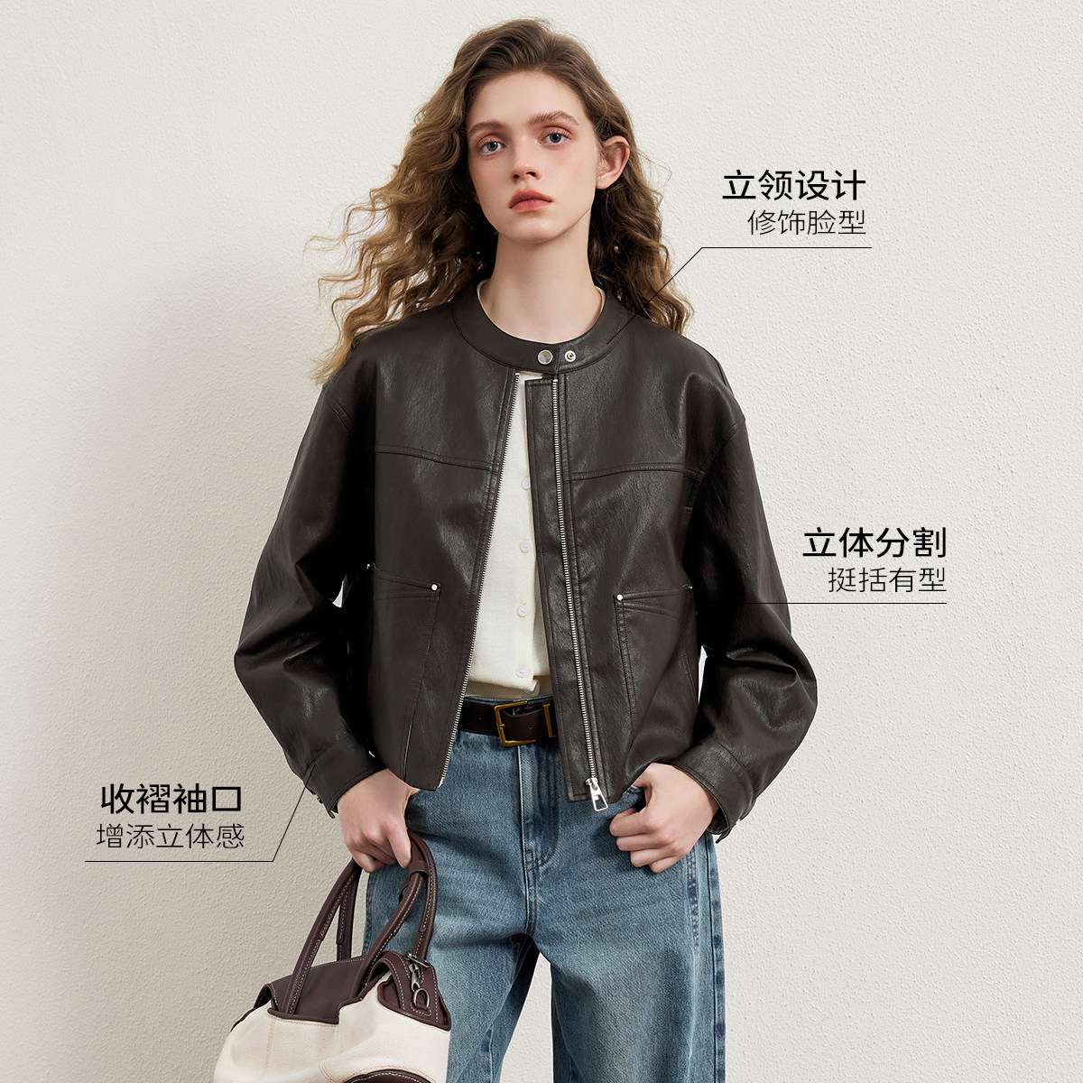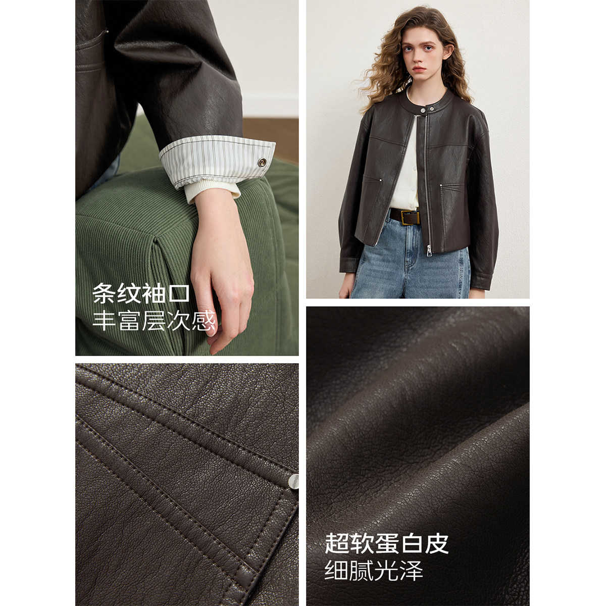 KBNE 2026春季新款摩登复古气质皮衣,采用优质PU皮材质,质感细腻挺括,兼具环保与时尚。小立领设计简约利落,短款剪裁凸显腰线,轻松拉长身形比例,展现女性干练优雅气质。棕色复古色调百搭耐看,融合现代摩登元素与经典复古风格,适合通勤、休闲等多种场合。袖口与下摆细节精致,走线工整,彰显品牌匠心工艺。无论是搭配连衣裙还是高腰裤,都能轻松打造 chic 都市造型,是春季衣橱不可或缺的时尚单品。