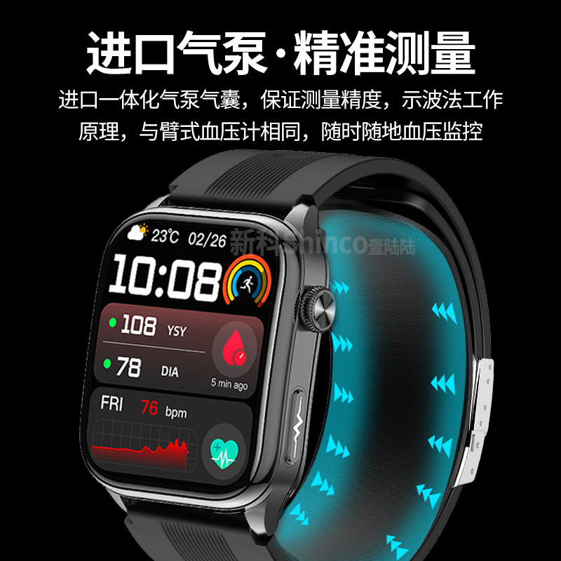新科Shinco高精准气泵健康监测手表,集多项前沿健康科技于一体,是守护日常健康的智能首选。采用医用级气泵加压技术,实现高精度血压监测,媲美专业设备。支持ECG心电图、心率、血氧、体温及睡眠质量分析,更创新融合血糖趋势评估与情绪跟踪功能,全面掌握身体状态。气囊式测量确保数据稳定可靠,搭配智能算法,实时预警异常指标。24小时连续监测,数据同步手机APP,助力科学健康管理。无论是日常保健还是慢病管理,这款智能手环都以精准、便捷、专业的表现,成为现代人健康生活的得力助手。
