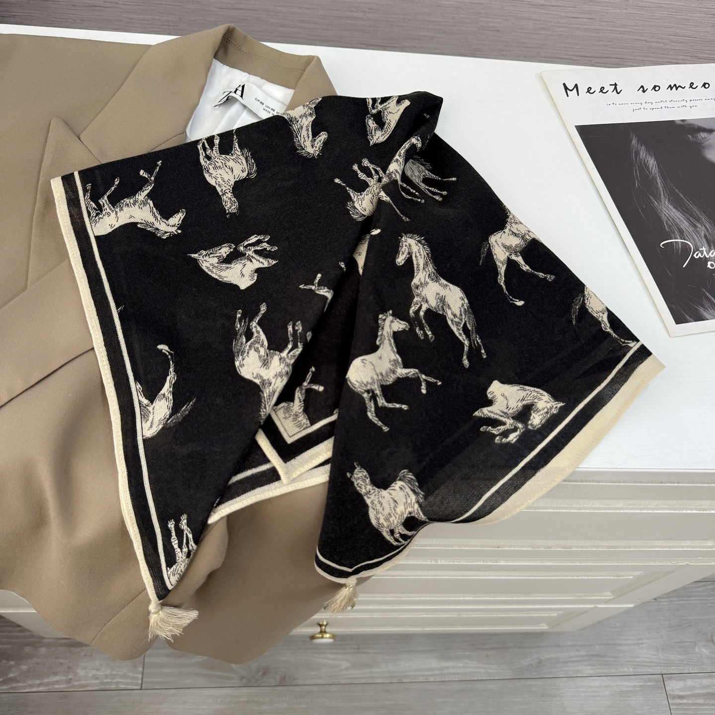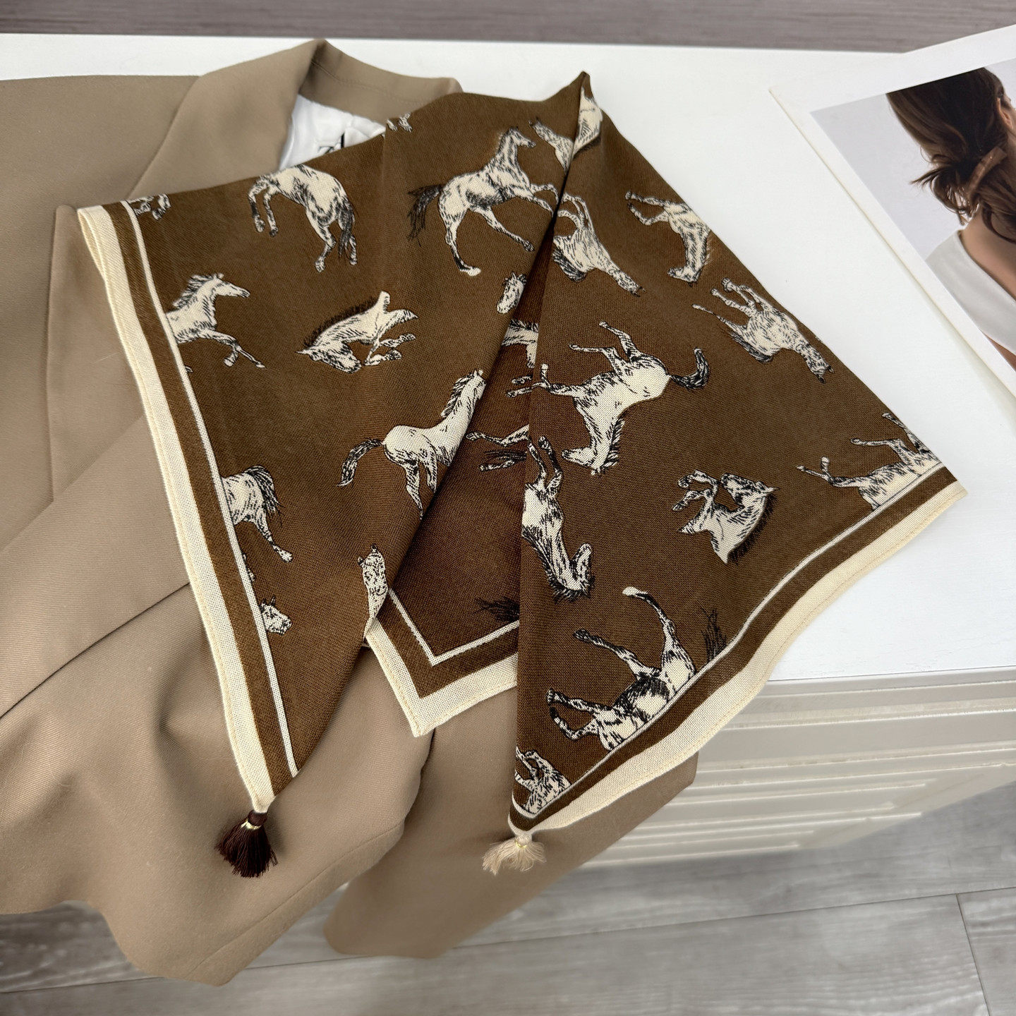 早春新款时尚小马方巾,采用优质仿羊毛材质,触感柔软亲肤,轻盈保暖,完美适配初春微凉天气。经典方巾设计,可随心变换多种佩戴方式——系于颈间增添优雅气质,围作护颈围巾抵御寒风,亦可点缀腰间提升整体造型层次感。细腻的马纹印花搭配高级哑光质感,彰显低调奢华品味。无论是通勤、约会还是日常出行,都能轻松驾驭,为春日穿搭注入一抹灵动与浪漫。精致包边工艺,经久耐用,是女性衣橱中不可或缺的时尚配饰,尽显高级感与独特魅力。