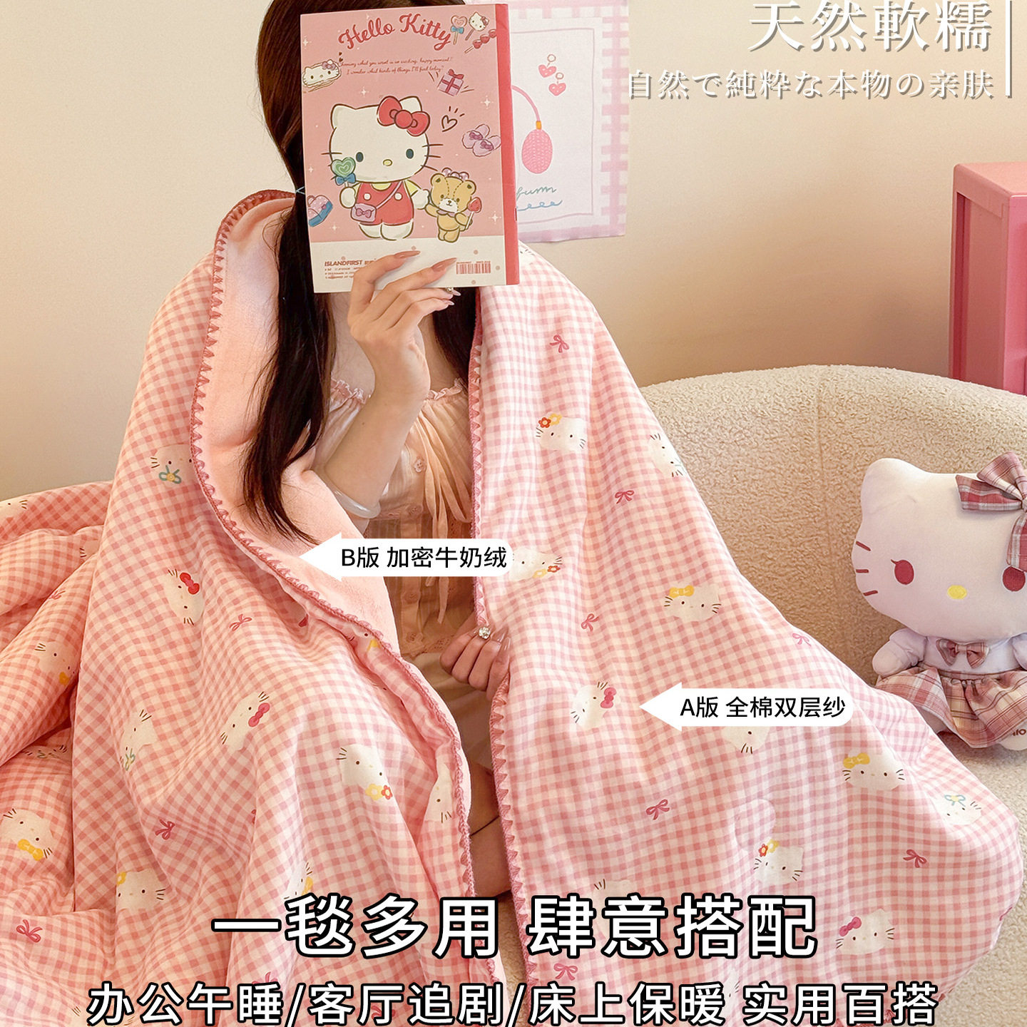 Hello Kitty毛毯,专为办公室午休与居家休闲设计,采用加厚纯棉牛奶绒面料,柔软亲肤、透气保暖,四季皆宜。细腻绒毛触感如牛奶般顺滑,带来舒适包裹感,即使在空调房内也能温暖不闷热。精致Hello Kitty图案萌趣可爱,为简约办公空间增添一抹温馨与活力。尺寸适中,轻松折叠收纳,无论是沙发小憩、办公桌午睡,还是居家观影,都是理想伴侣。易清洗、不褪色、不易起球,耐用又实用。让这款Hello Kitty毛毯陪伴您每一个放松时刻,享受安心惬意的休憩时光。