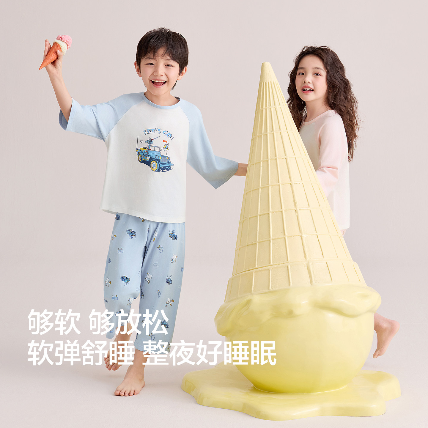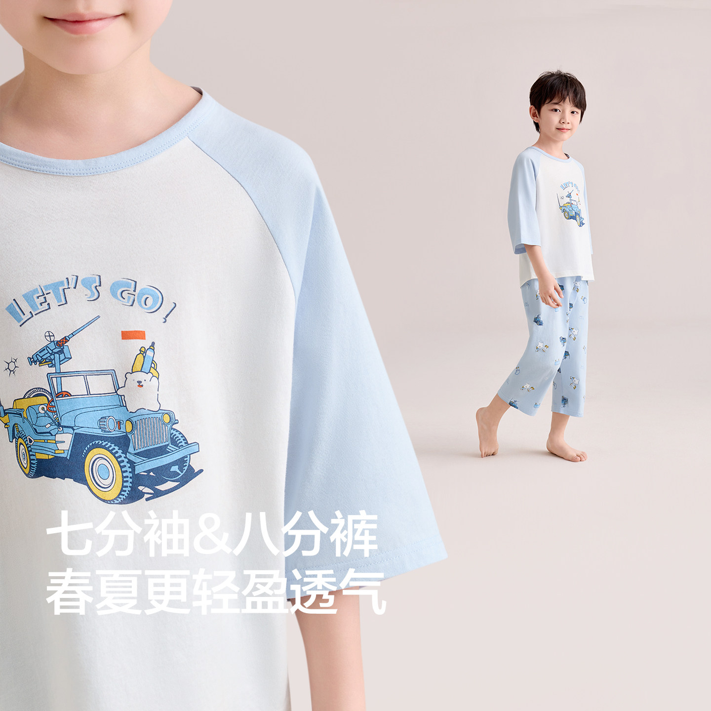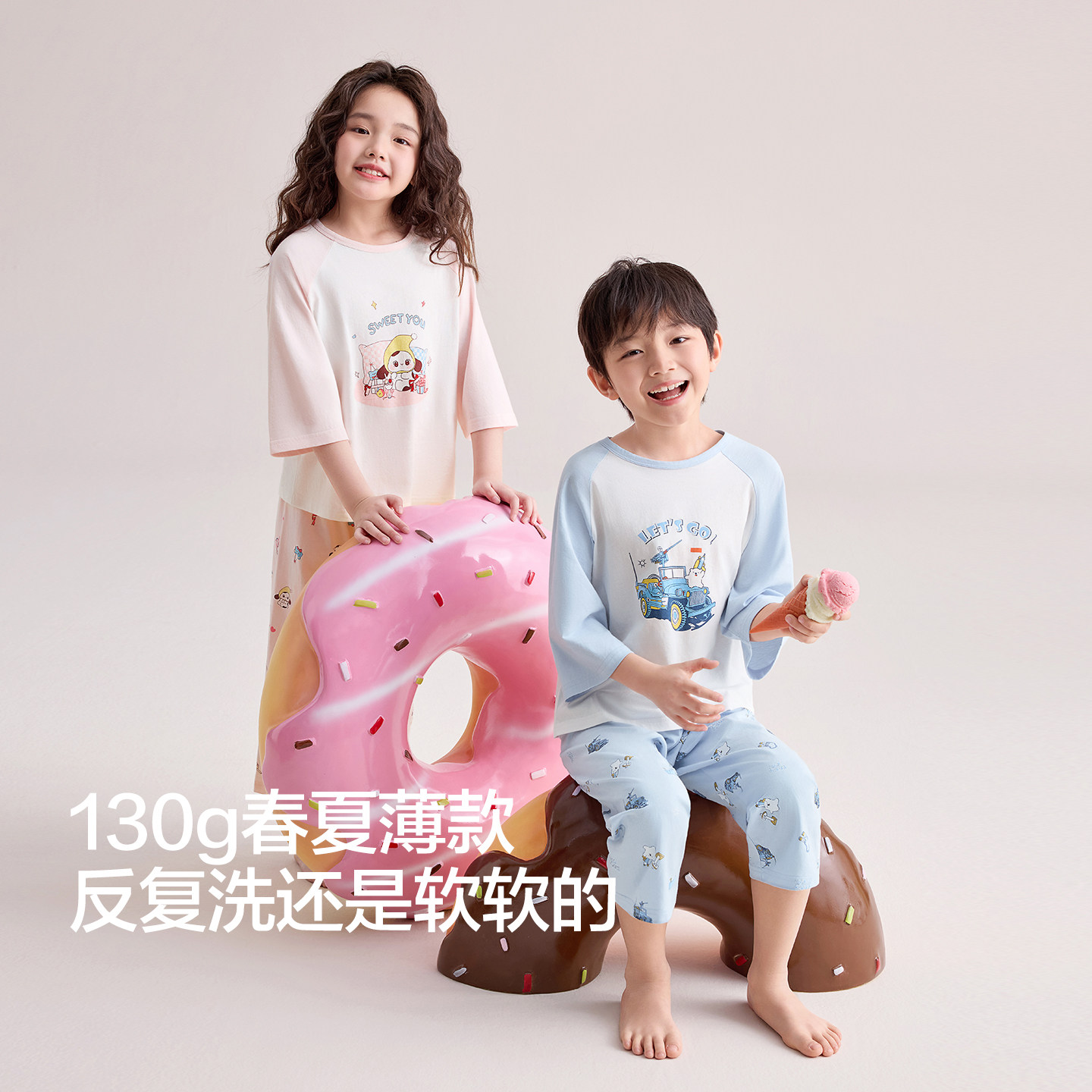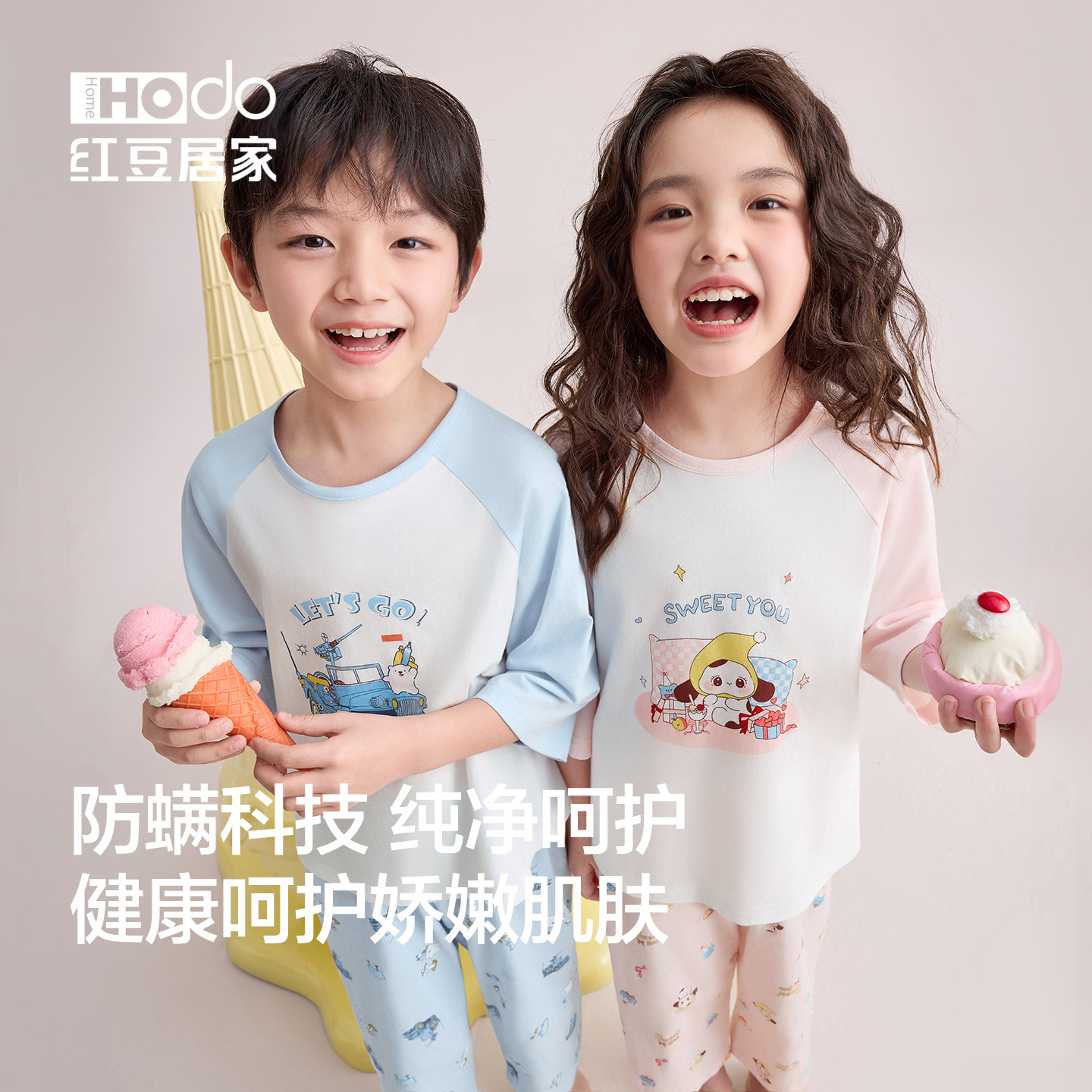 天猫红豆儿童睡衣纯棉套装七分袖男童家居服春夏女童宝宝空调服26新款