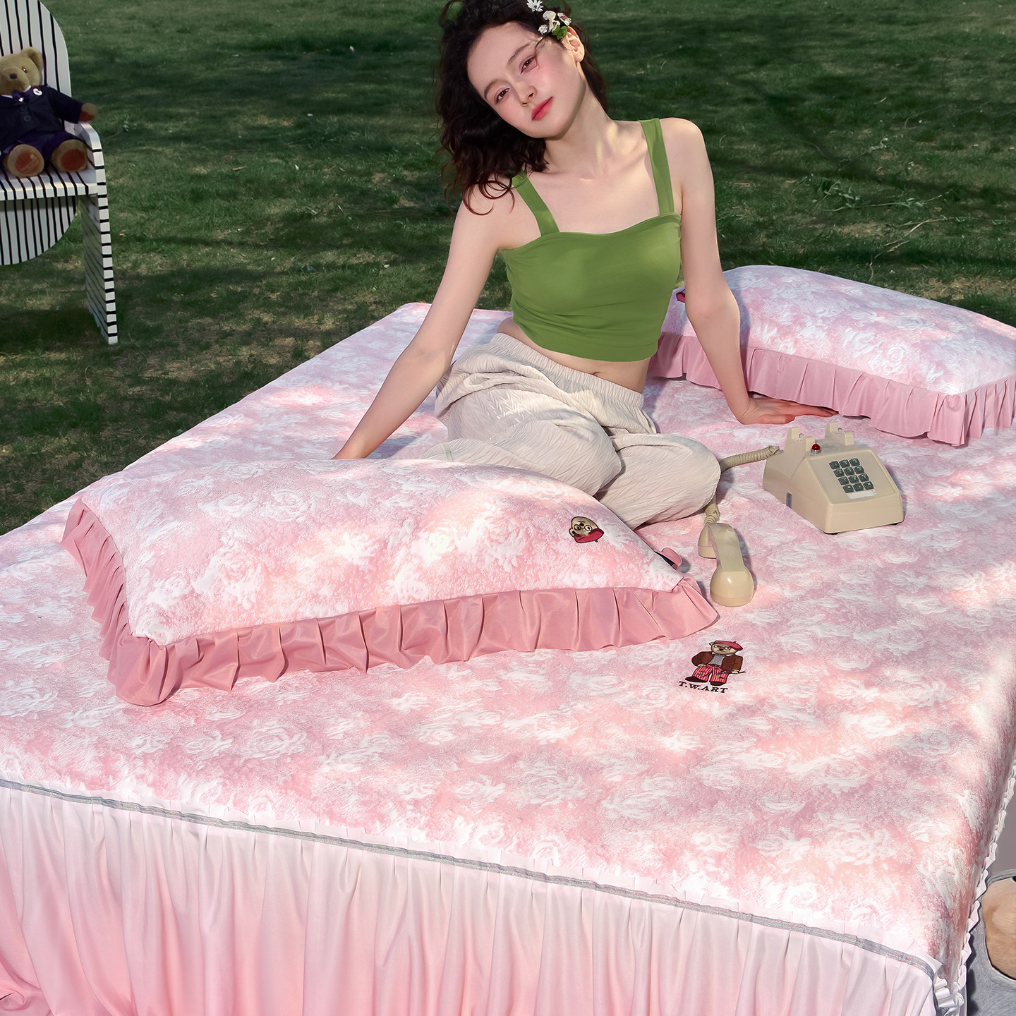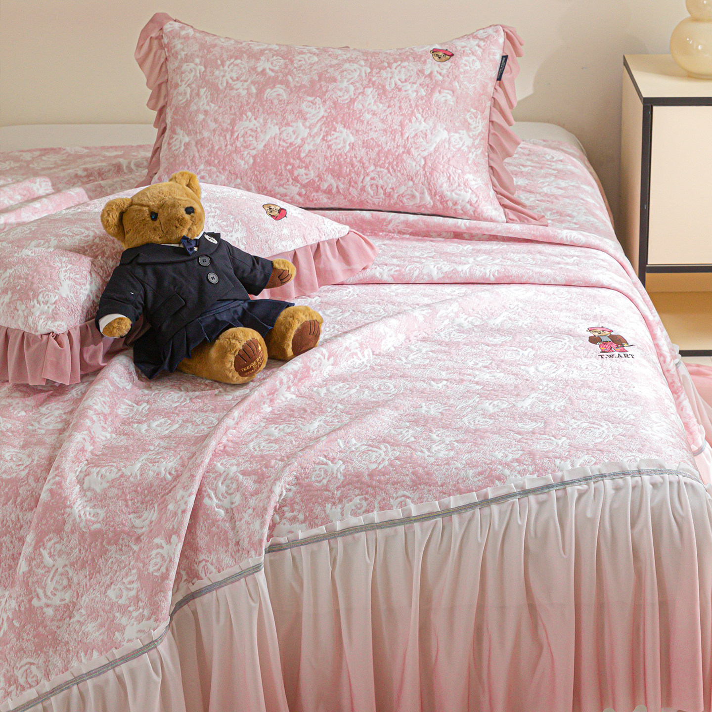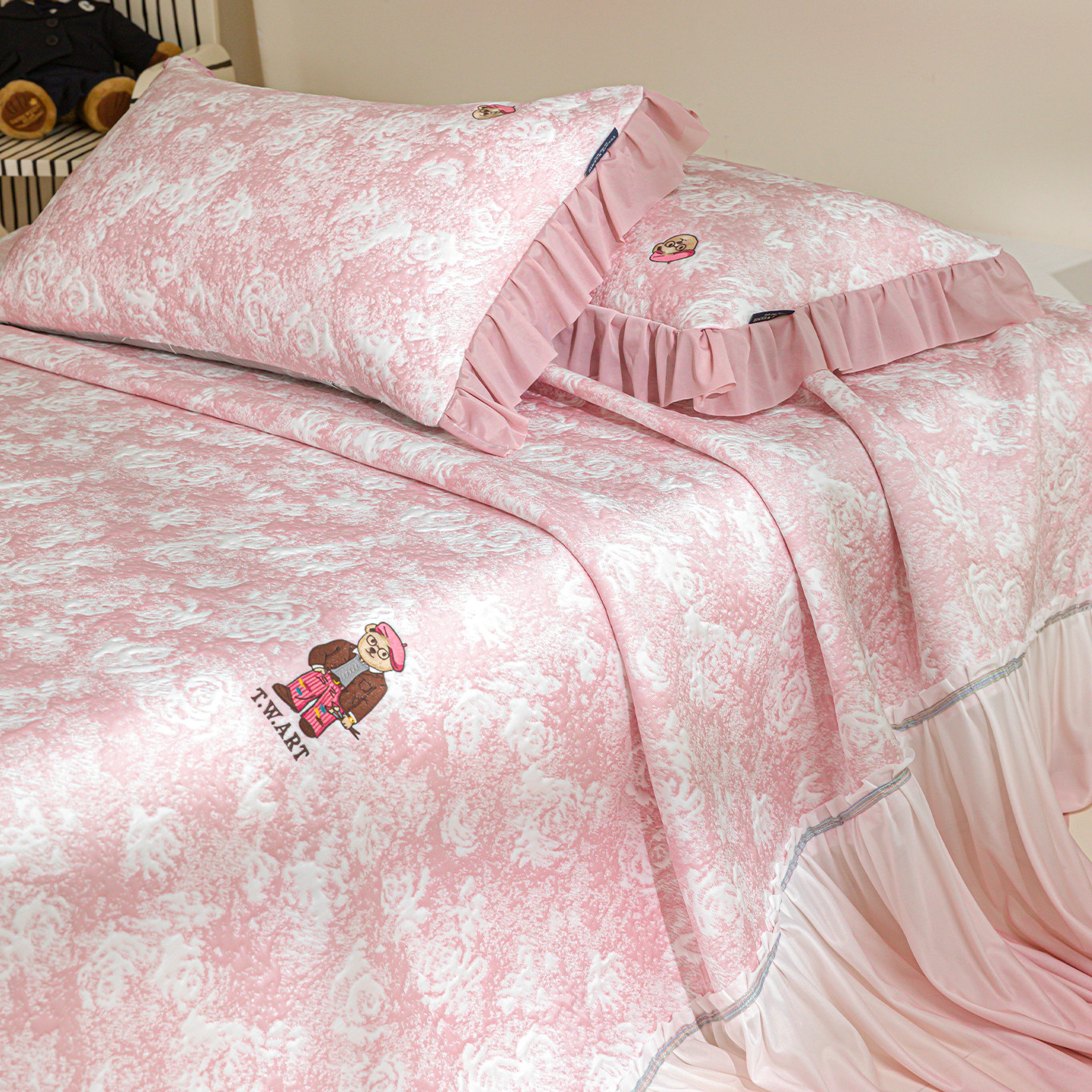 TeenieWeenie粉色公主风花边床裙款冰丝凉席三件套,专为追求甜美与舒适的你设计。采用高品质冰丝面料,触感清凉顺滑,透气排湿,有效降温,是夏日空调房的理想选择。床裙花边设计精致浪漫,完美贴合床垫,增添卧室的梦幻公主气息。三件套包含席面、床单与枕套,搭配协调,实用又美观。支持机洗水洗,清洁便捷,不易变形褪色,持久耐用。无论是儿童房、少女闺房还是温馨主卧,都能营造清爽宜人的睡眠环境。TeenieWeenie以贴心细节与高颜值设计,让每一晚都如公主般优雅安睡。