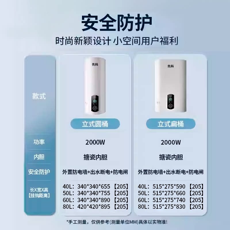 先科竖立式家用电热水器,采用先进的双胆分层加热技术,实现快速升温与节能省电双重优势。具备“出水断电”安全功能,洗浴时自动切断电源,有效防止漏电风险,保障家人安全。储水式设计满足全家连续洗浴需求,竖立安装节省空间,适合卫生间挂墙使用。机身小巧美观,操作简便,支持多档功率调节,适配不同季节用水习惯。内胆采用优质材料,防腐耐用,延长使用寿命。无论是日常洗漱还是冬季沐浴,都能提供稳定热水,是现代家庭舒适洗浴的理想之选。安全、高效、省空间,先科电热水器让热水生活更安心便捷。