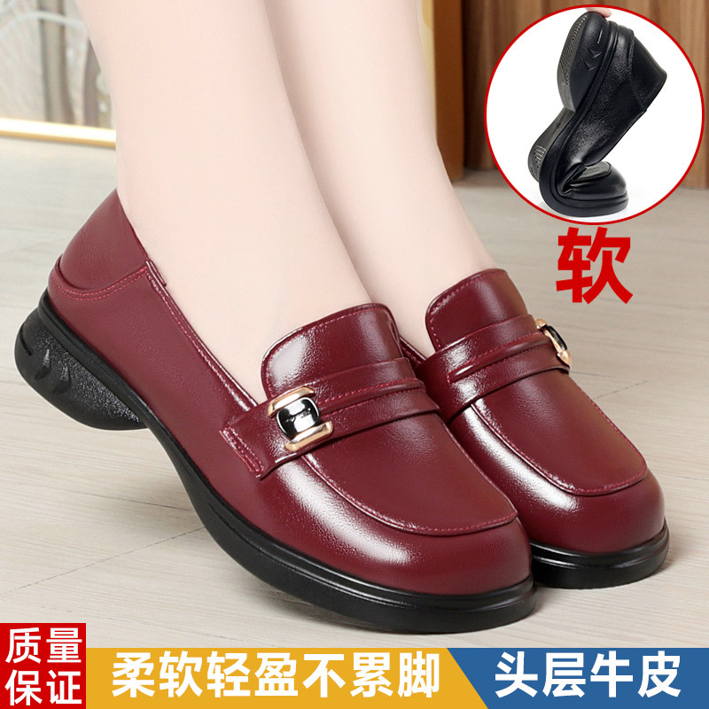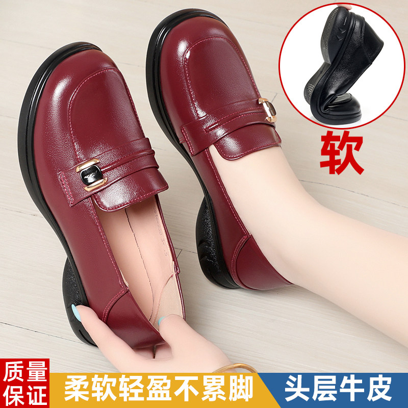 天猫酒红色妈妈鞋单鞋真皮软底中年女士皮鞋中老年舒适软皮大码女鞋子
