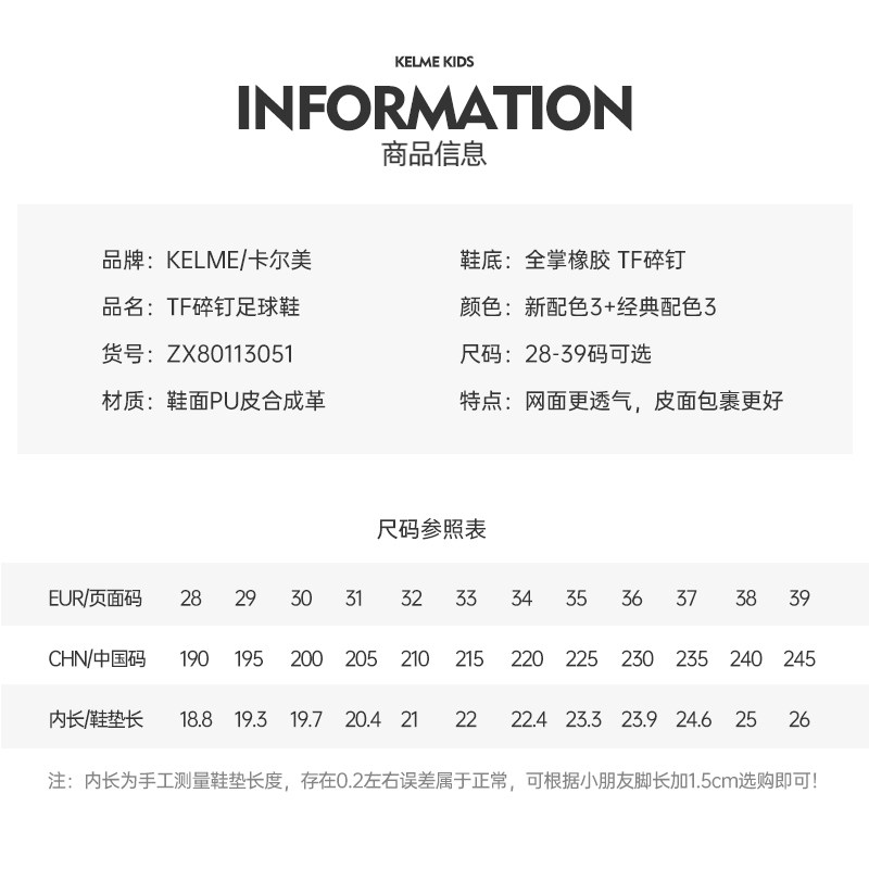 卡尔美儿童足球鞋专为男童女童设计,采用轻盈透气的网面材质,有效排汗散热,让孩子在运动中保持足部干爽舒适。鞋面搭配便捷魔术贴设计,穿脱方便,适合孩子自主操作。鞋底配置TF碎钉系统,提供出色的抓地力与防滑性能,适应多种人造草场及硬地训练场景。整体结构兼顾支撑性与灵活性,有效保护脚踝,助力孩子提升球技。简约时尚的外观搭配亮眼配色,兼具运动性能与潮流感,是学生日常训练和校园足球活动的理想选择,陪伴孩子在绿茵场上自信奔跑、快乐成长。