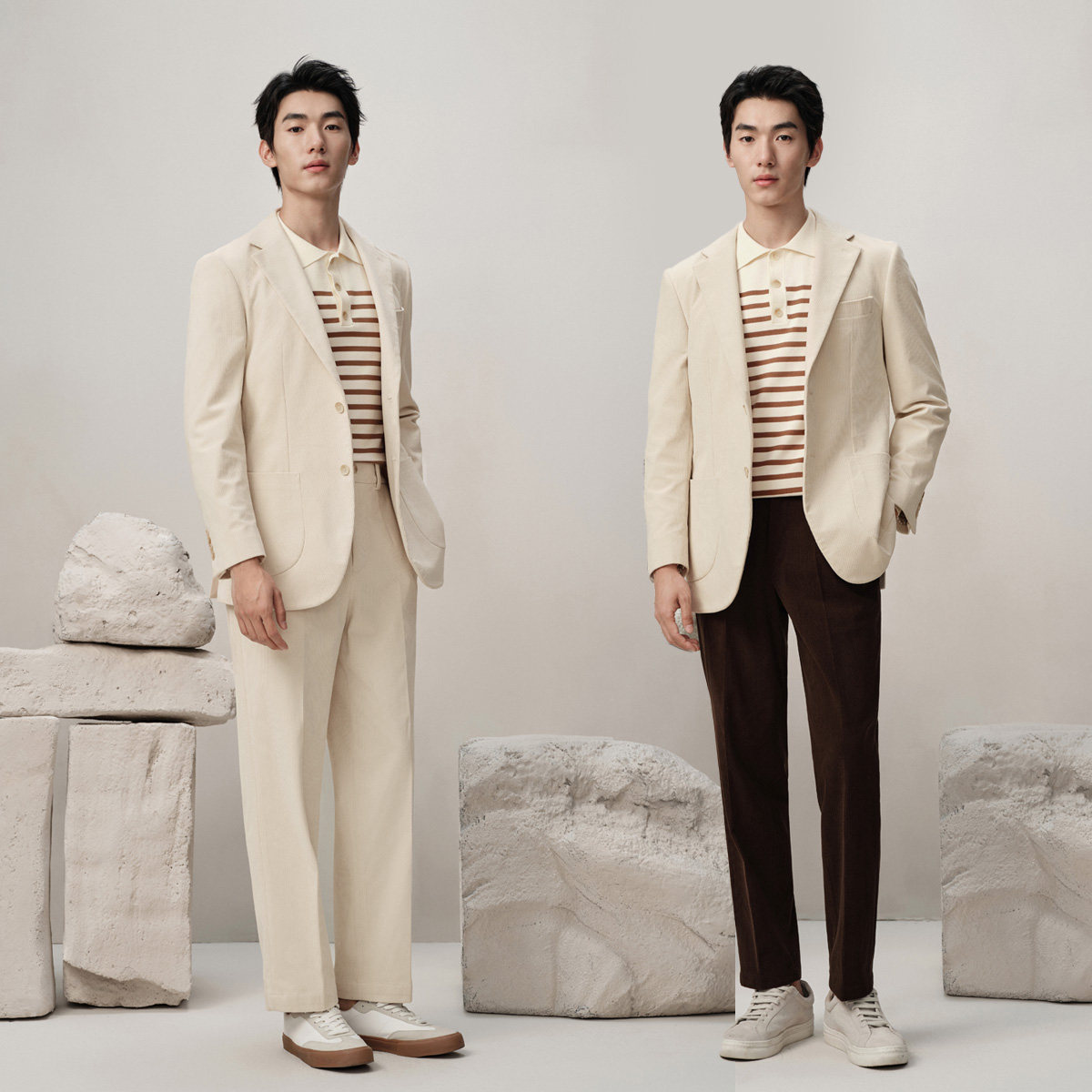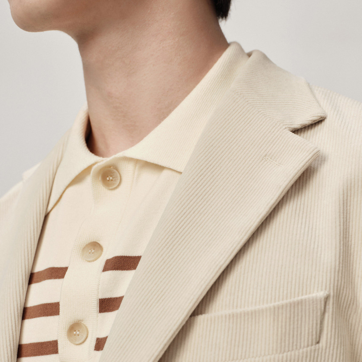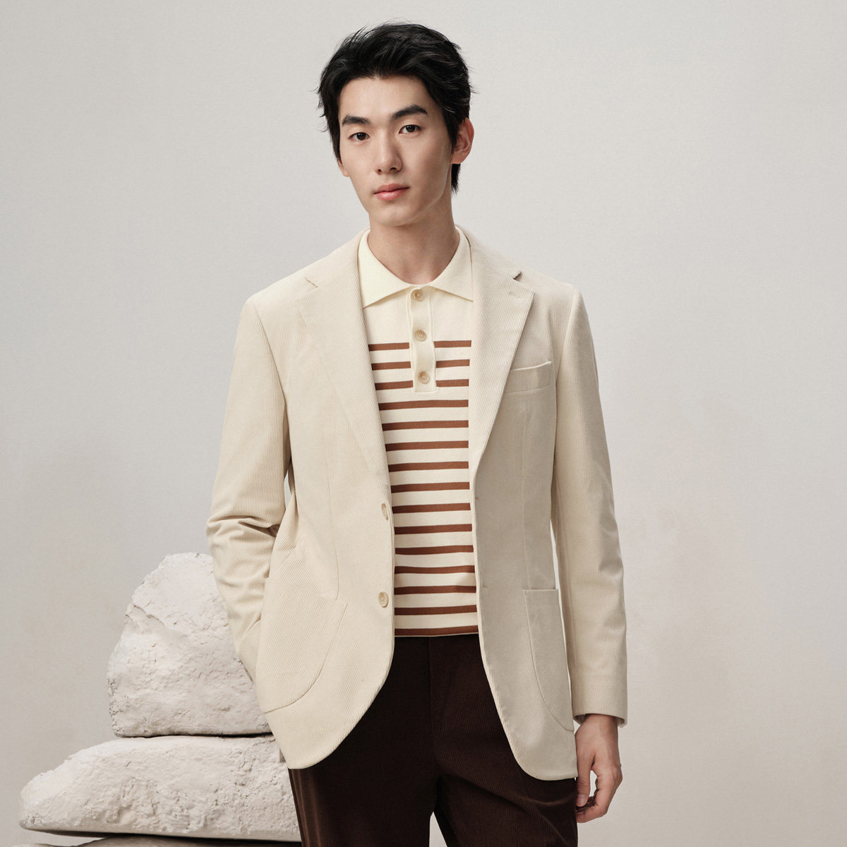 吉约蒙米白色灯芯绒商务休闲单西,融合经典与时尚,专为追求品质的都市男士打造。采用优质灯芯绒面料,触感细腻,保暖透气,完美契合秋冬季节穿着需求。简约利落的剪裁搭配精致走线,凸显高级质感与优雅轮廓。米白色调百搭且显气质,轻松驾驭商务、休闲等多种场合。翻领设计、单排扣门襟与实用口袋细节,兼顾美观与功能性。无论是搭配西裤打造轻商务风,还是配牛仔裤演绎随性格调,皆能展现从容自信的型格魅力。吉约蒙以匠心工艺诠释现代男士的穿衣哲学,是衣橱中不可或缺的质感单品。