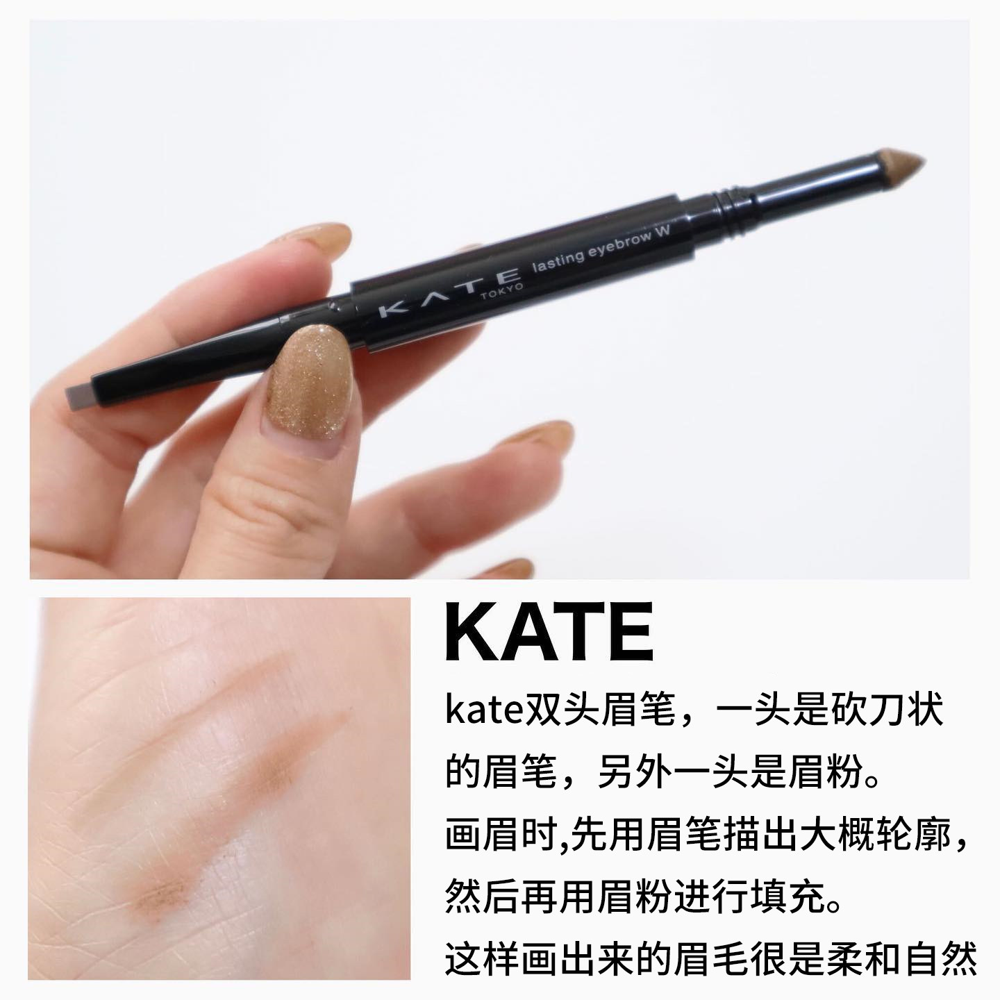 日本KATE凯朵立体双效双头眉笔眉粉(BR3自然棕、BR5深棕)是一款集眉笔与眉粉于一体的二合一产品,轻松打造自然立体眉形。扁头笔芯设计,可精准勾勒眉尾,也能快速填充眉色;另一端搭配细腻眉粉,晕染自然,增强眉部层次感。BR3适合浅发色或自然妆容,BR5则更契合深发色或浓颜风格。产品防水防汗,持久不脱妆,即便在炎热或潮湿环境下也能保持眉妆完整。质地柔滑不结块,新手也能轻松上手。KATE作为日本开架彩妆代表品牌,以高性价比和专业妆效深受消费者喜爱,是日常通勤与外出妆容的理想选择。