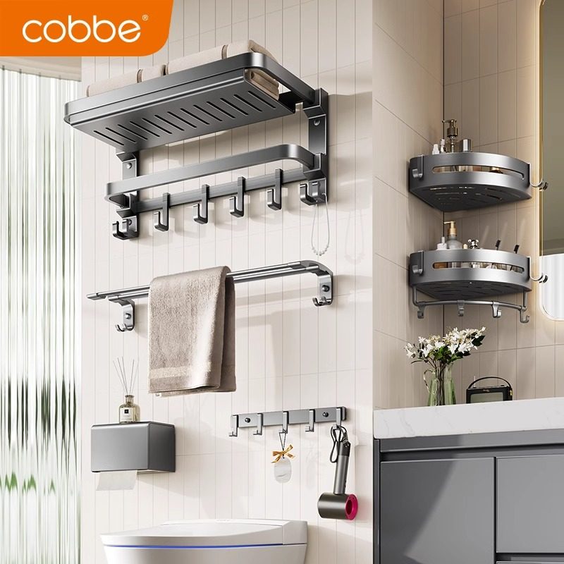 淘卡贝卫生间毛巾架免打孔浴室置物架奶油风浴巾架太空铝厕所挂件