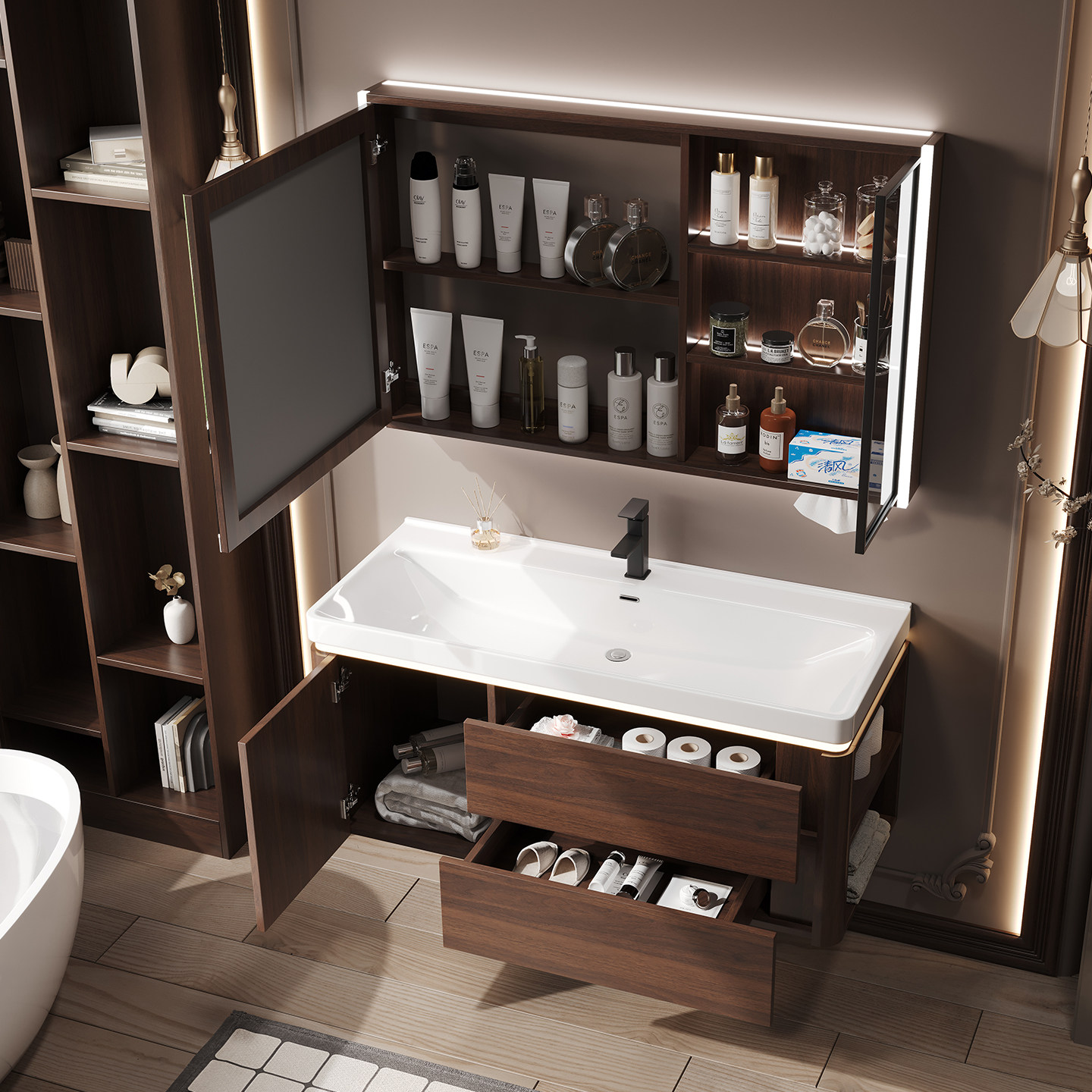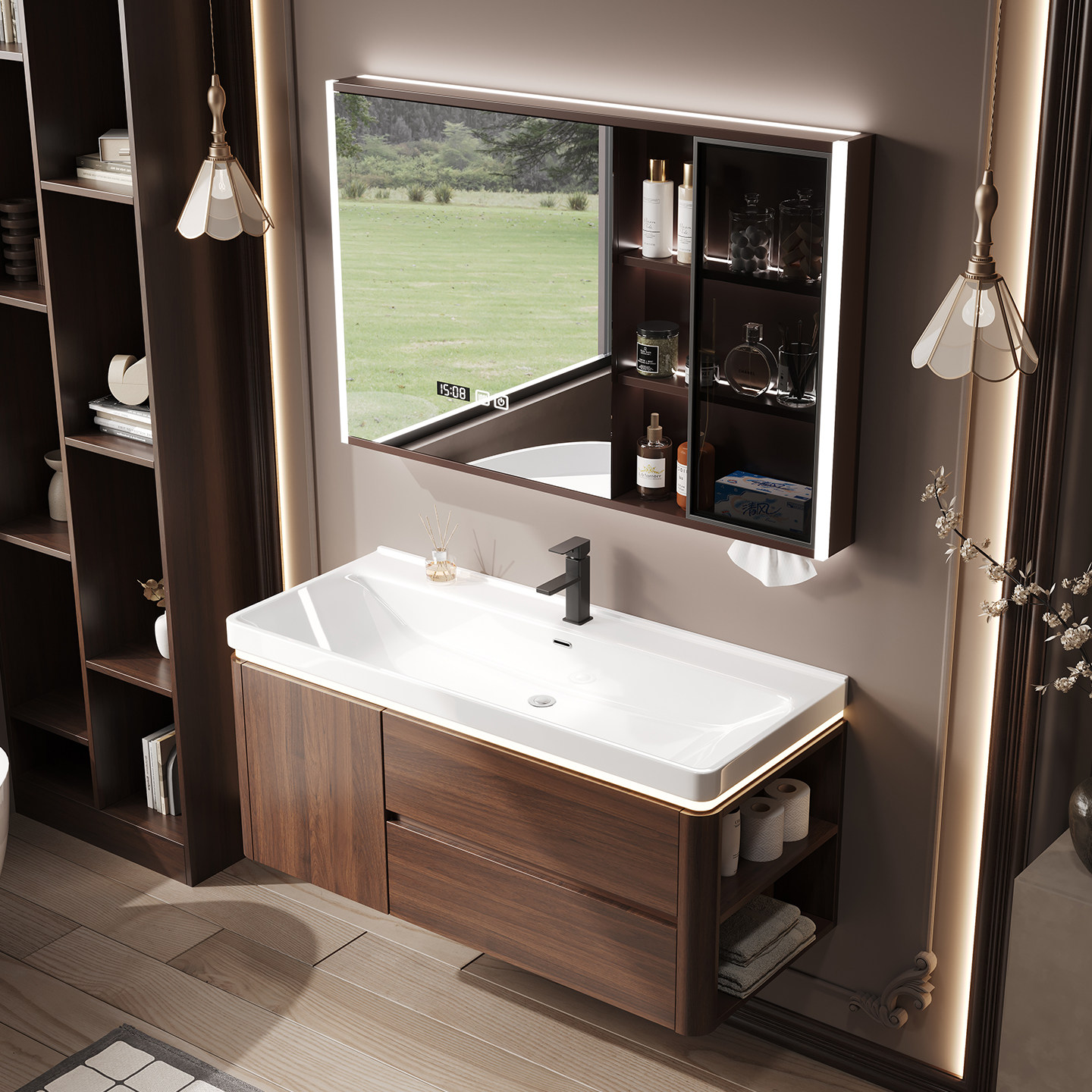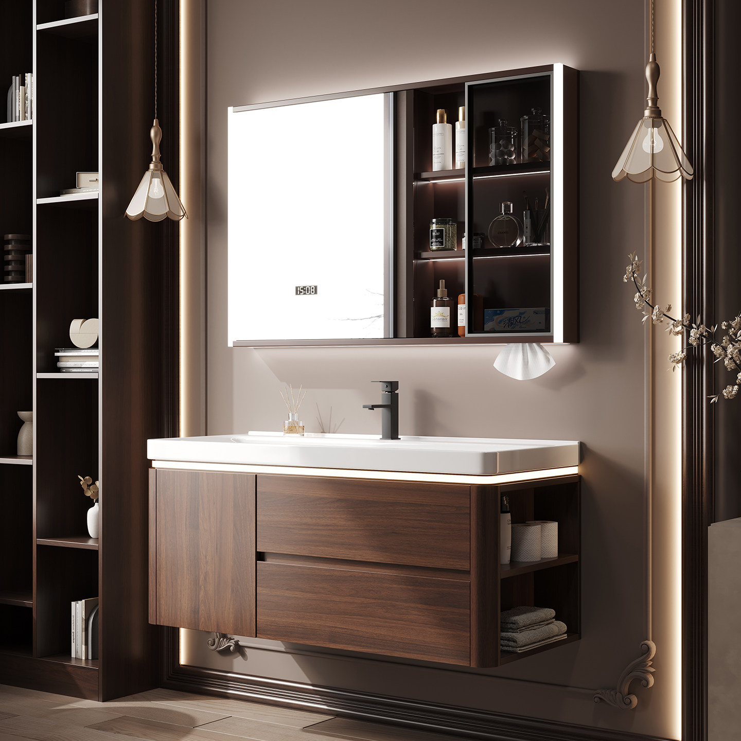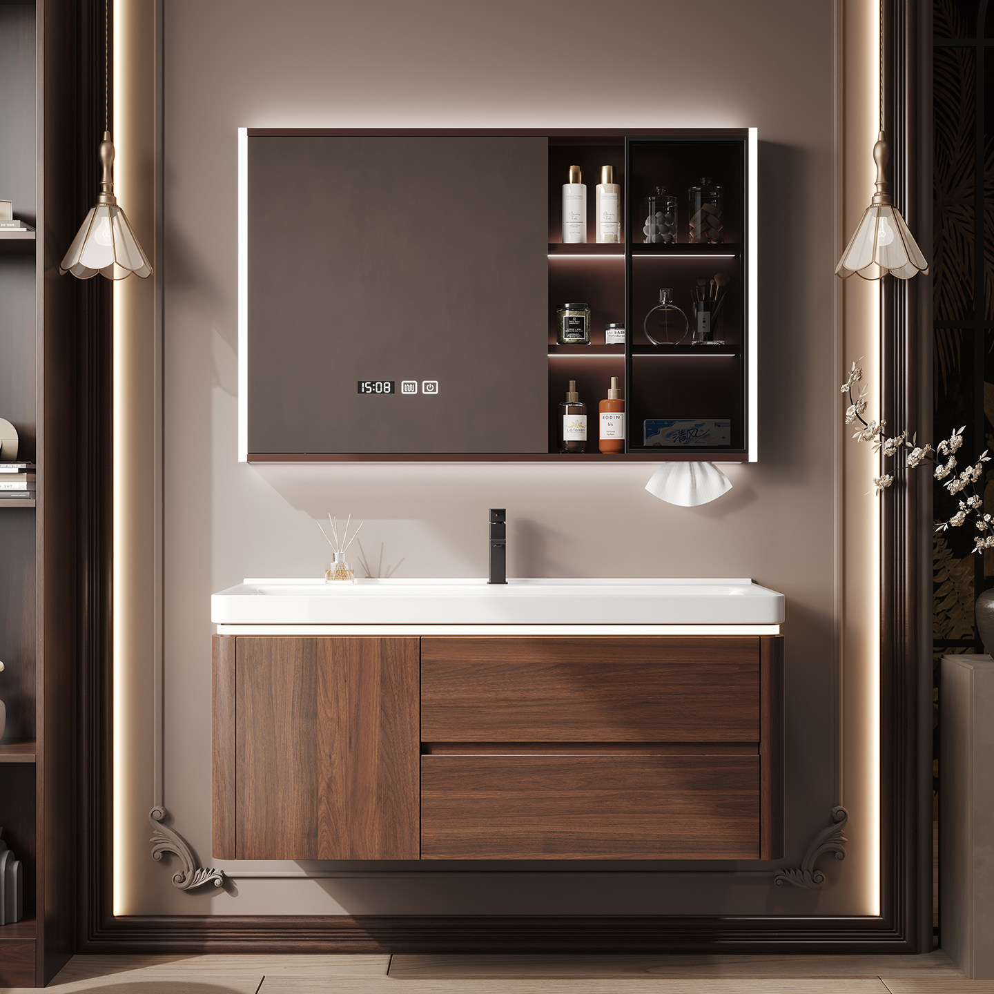 这款中古风胡桃木色浴室柜组合,融合经典复古美学与现代实用功能,为卫浴空间注入沉稳雅致的格调。精选优质胡桃木材质,纹理细腻、色泽温润,搭配哑光金属拉手,彰显低调奢华质感。柜体结构稳固,储物空间合理分区,满足日常收纳需求。搭配陶瓷一体成型海洋大盆洗手池,线条流畅、釉面光滑易洁,兼具美观与实用性。整体设计注重细节与比例,适用于多种装修风格,尤其契合追求品质与艺术感的现代家居。安装便捷,防潮耐用,是提升卫生间格调的理想之选。