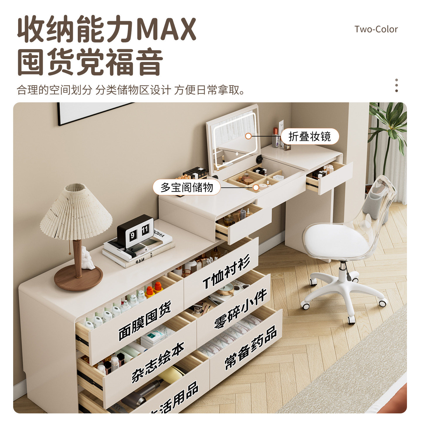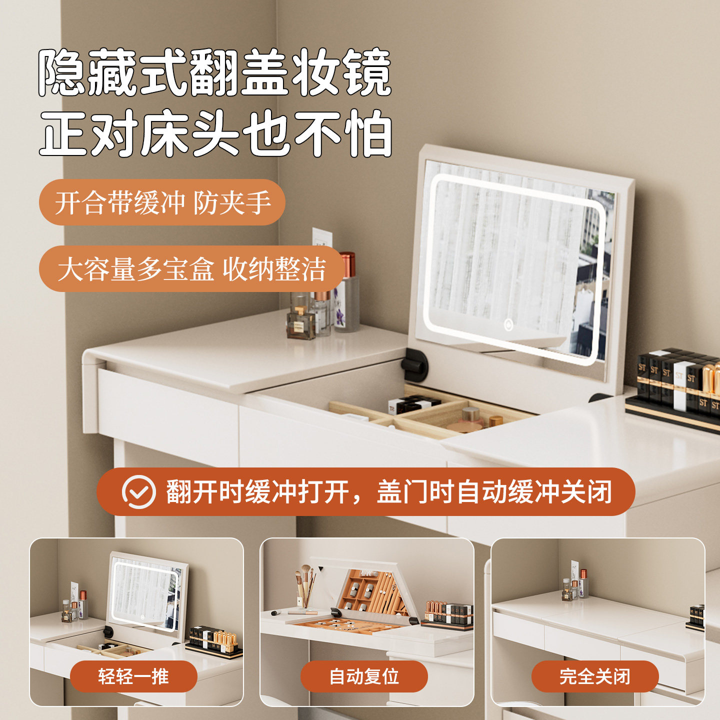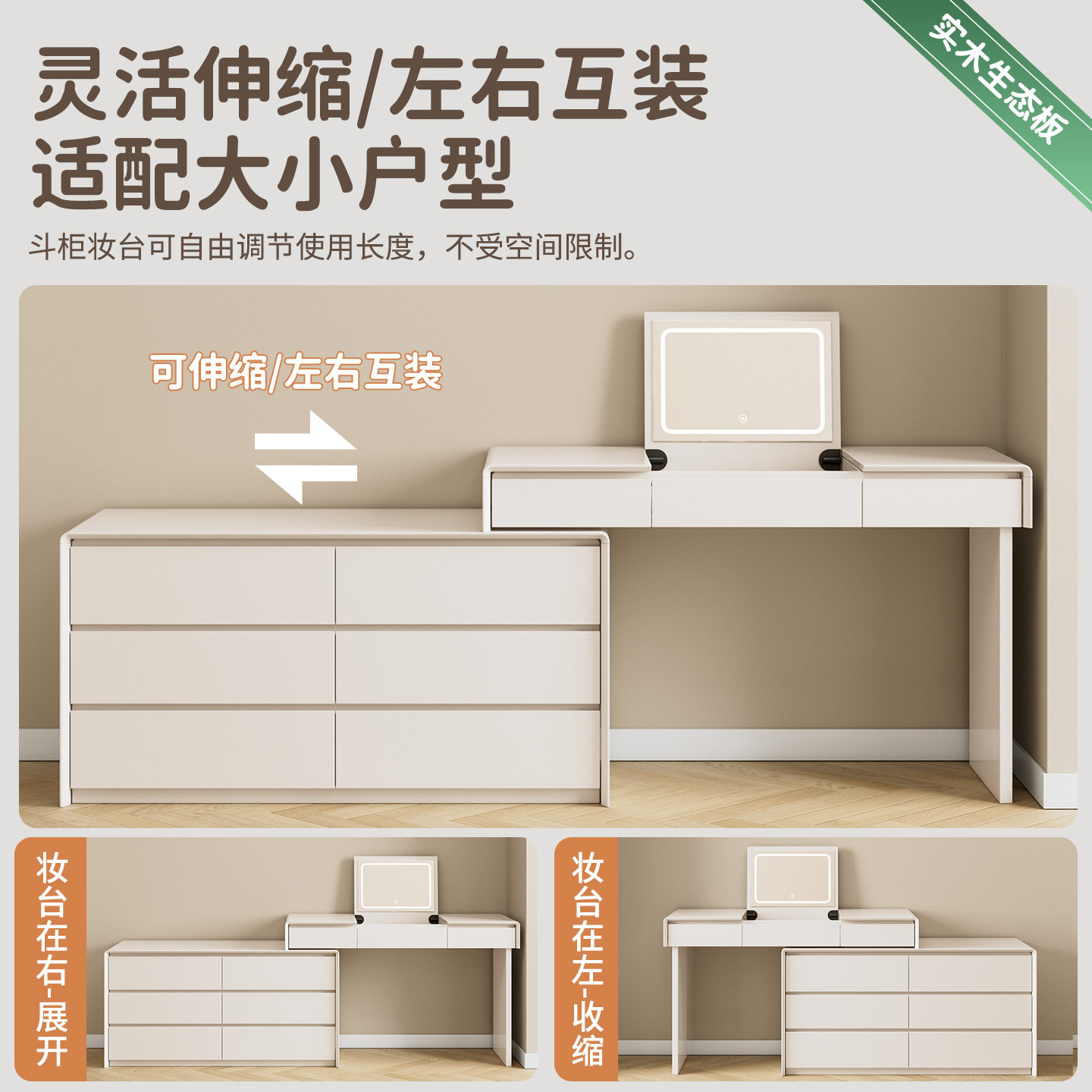 2025新款小户型实木斗柜梳妆台,集化妆、储物、办公于一体,专为现代都市空间优化设计。精选优质实木打造,环保耐用,质感温润,搭配简约北欧或轻奢风格,轻松融入卧室、床尾或角落空间。台面宽敞,配有大容量抽屉与开放式储物格,收纳化妆品、首饰、书籍井然有序。高清防雾梳妆镜可多角度调节,搭配柔和LED灯带,打造专业级美妆体验。部分款式延伸为可折叠书桌,一桌多用,满足化妆、阅读、办公多元需求。小巧身形却功能强大,是小户型提升生活品质的实用之选。